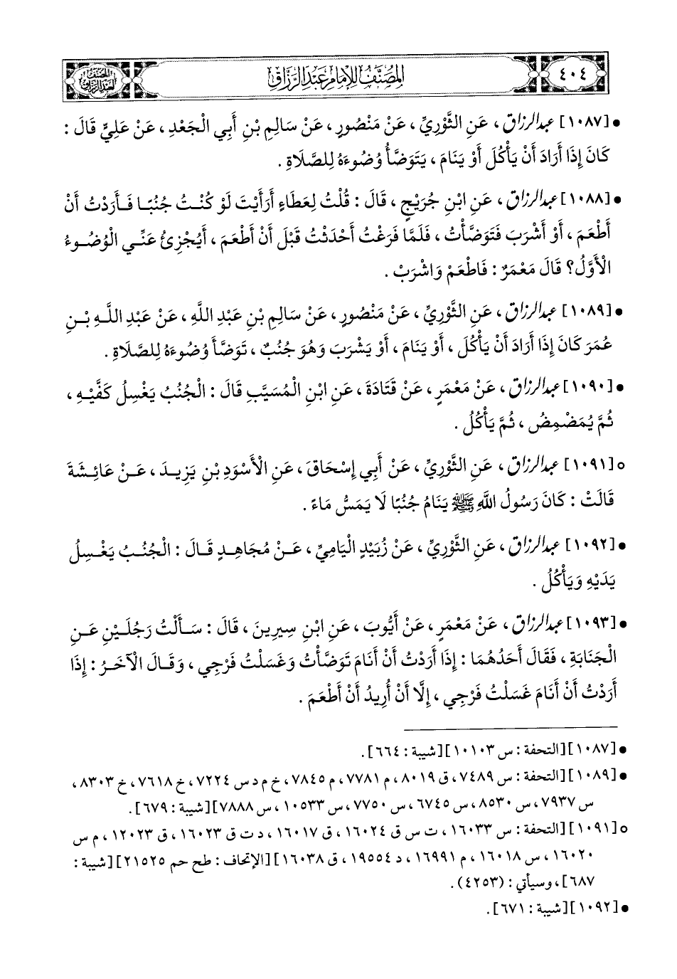 1089- عبد الرزاق، عَنِ الثَّورِيِّ، عَنْ مَنصُورٍ، عَن سَالِمِ بْنِ عَبدِ اللهِ، عَنْ عَبدِ اللهِ بْنِ عُمَرَ كَانَ إِذَا أَرَادَ أَنْ يَأْكُلَ، أَوْ يَنَامَ، أَوْ يَشْرَبَ وَهُوَ جُنُبٌ تَوَضَّأَ وُضُوءَهُ لِلصَّلاَةِ.