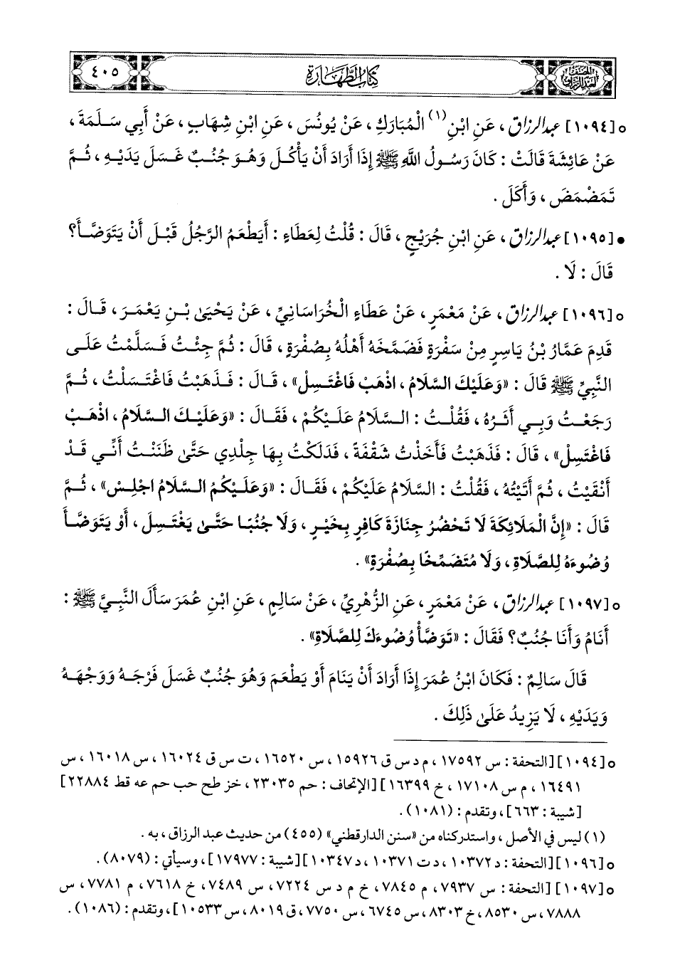 1097- عبد الرزاق، عَنْ مَعْمَرٍ، عَنِ الزُّهْرِيِّ، عَن سَالِمٍ، عَنِ ابْنِ عُمَرَ (1)؛ سَأَلَ النَّبِيَّ صَلَّى اللهُ عَلَيْهِ وَسَلَّمَ: أَنَامُ وَأَنَا جُنُبٌ؟ فَقَالَ: تَوَضَّأْ وُضُوءَكَ لِلصَّلاَةِ.