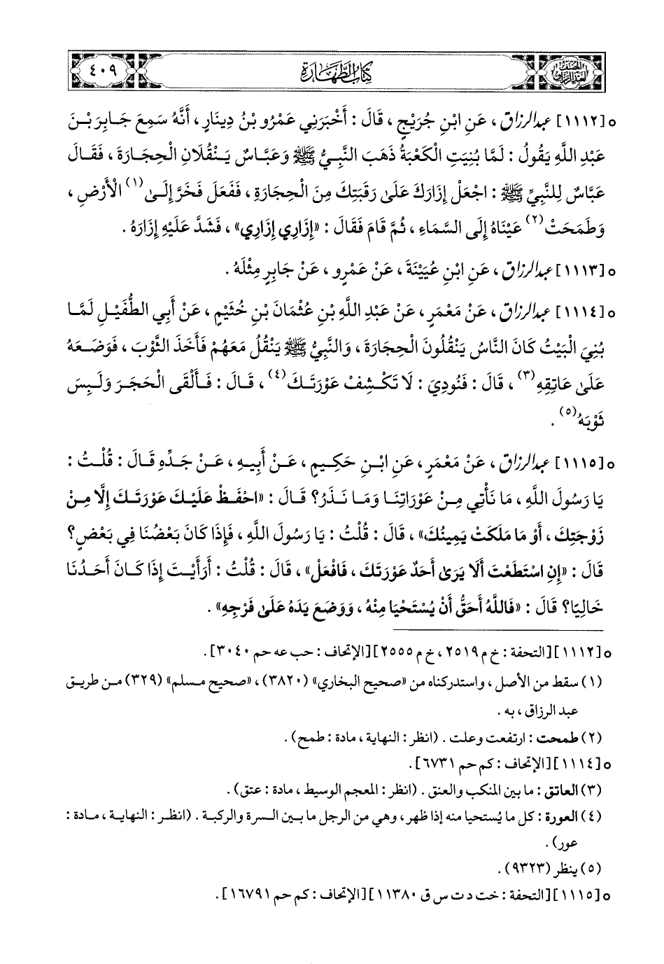 1114- عبد الرزاق، عَنْ مَعْمَرٍ، عَنْ عَبدِ اللهِ بْنِ عُثْمَانَ بْنِ خُثَيْمٍ، عَنْ أَبِي الطُّفَيْلِ: لَمَّا بُنِيَ الْبَيْتُ، كَانَ النَّاسُ يَنْقُلُونَ الْحِجَارَةَ، وَالنَّبِيُّ صَلَّى اللهُ عَلَيْهِ وَسَلَّمَ يَنْقُلُ مَعَهُمْ، فَأَخَذَ الثَّوْبَ، فَوَضَعَهُ عَلَى عَاتِقِهِ، قَالَ: فَنُودِيَ: لاَ تَكْشِفْ عَوْرَتَكَ، قَالَ: فَأَلْقَى الْحَجَرَ وَلَبِسَ ثَوْبَهُ.