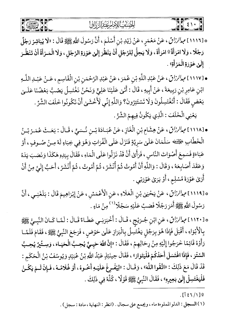 1116- عبد الرزاق، عَنْ مَعْمَرٍ، عَن زَيْدِ بْنِ أَسْلَمَ، أَنَّ رَسُولَ اللهِ صَلَّى اللهُ عَلَيْهِ وَسَلَّمَ قَالَ: لاَ يُبَاشِرُ رَجُلٌ رَجُلاً، وَلاَ امْرَأَةٌ امْرَأَةً، وَلاَ يَحِلُّ لِلرَجُلٍ أَنْ يَنْظُرَ إِلَى عَوْرَةِ الرَّجُلِ، وَلاَ المَرْأَةُ أَنْ تَنْظُرَ إِلَى عَوْرَةِ المَرْأَةِ.