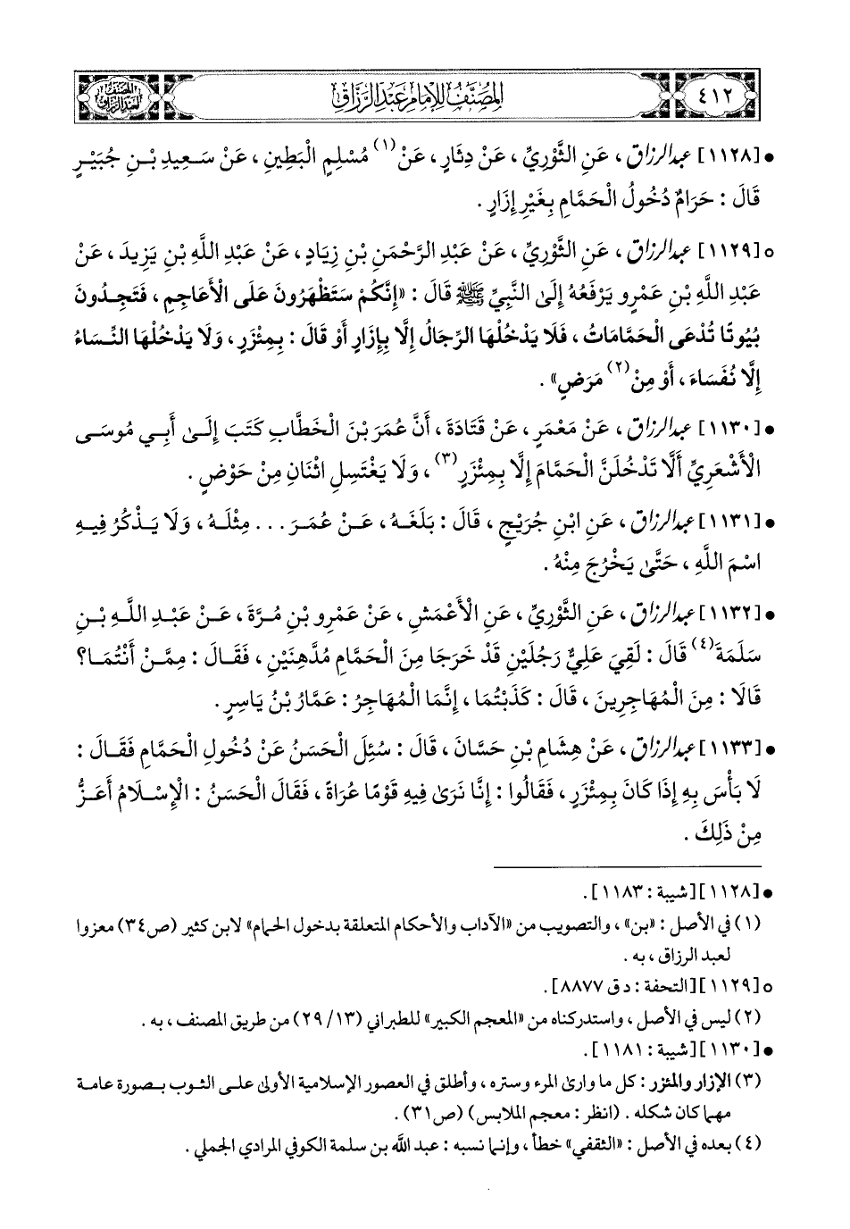 1129- عبد الرزاق، عَنِ الثَّورِيِّ، عَنْ عَبدِ الرَّحْمَنِ بْنِ زِيَادٍ، عَنْ عَبدِ اللهِ بْنِ يَزِيدَ، عَنْ عَبدِ اللهِ بْنِ عَمْرٍو، يَرْفَعُهُ إِلَى النَّبِيِّ صَلَّى اللهُ عَلَيْهِ وَسَلَّمَ قَالَ: إِنَّكُمْ سَتَظْهَرُونَ عَلَى الأَعَاجِمِ، فَتَجِدُونَ بُيُوتًا تُدْعَى الْحَمَّامَاتِ، فَلاَ يَدْخُلْهَا الرِّجَالُ إِلاَّ بِإِزَارٍ، أَوْ قَالَ: بِمِئْزَرٍ، وَلاَ يَدْخُلْهَا النِّسَاءُ إِلاَّ نُفَسَاءَ، أَوْ مِنْ مَرَضٍ.