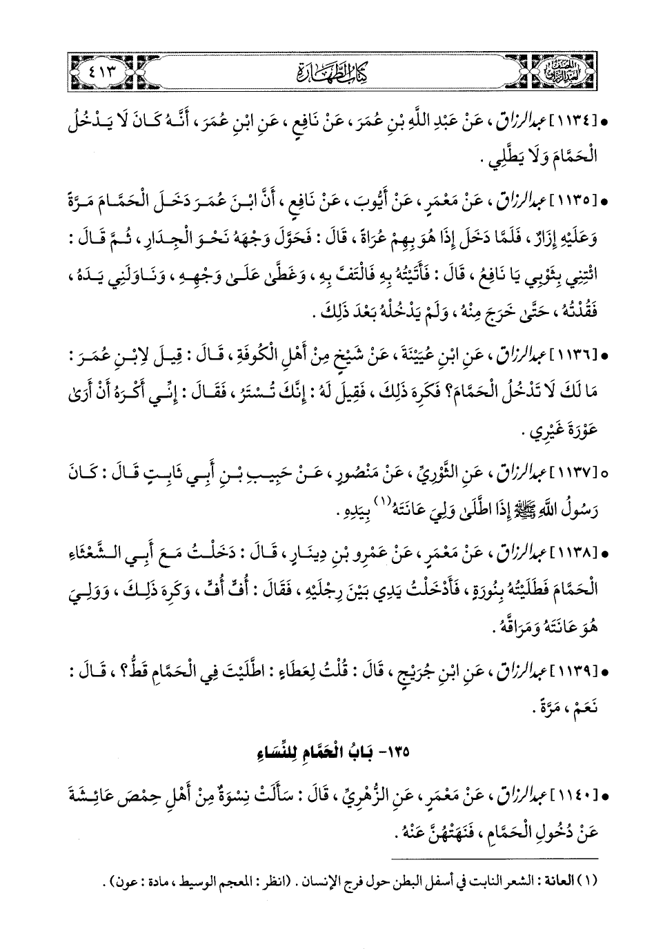 1134- عبد الرزاق، عَنْ عَبدِ اللهِ بْنِ عُمَرَ، عَن نَافِعٍ، عَنِ ابْنِ عُمَرَ؛ أَنَّهُ كَانَ لاَ يَدْخُلُ الْحَمَّامَ وَلاَ يَطَّلِي.