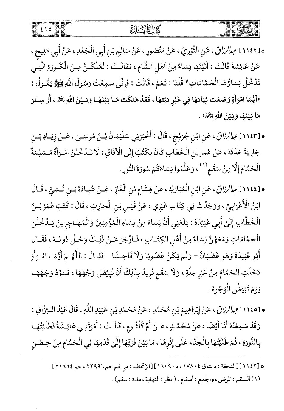 1144- عبد الرزاق، عَنِ ابْنِ المُبَارَكِ، عَن هِشَامِ بْنِ الْغَازِ، عَن عُبَادَةَ بْنِ نُسَيٍّ، (قَالَ ابْنُ الأَعْرَابِيِّ (1): ووَجَدْتُ فِي كِتَابِ غَيْرِي:) عَن قَيْسِ بْنِ الْحَارِثِ قَالَ: كَتَبَ عُمَرُ بن الْخَطَّابِ إِلَى أَبِي عُبَيْدَةَ: بَلَغَنِي أَنَّ نِسَاءً مِنْ نِسَاءِ المُؤْمِنِينَ وَالمُهَاجِرِينَ يَدْخُلْنَ الْحَمَّامَاتِ وَمَعَهُنَّ نِسَاءٌ مِنْ أَهْلِ الْكِتَابِ، فَازْجُرْ عَن ذَلِكَ وَحُلْ دُونَهُ، فَقَالَ أَبو عُبَيْدَةَ وَهُوَ غَضْبَانُ، وَلَمْ يَكُنْ غَضُوبًا وَلاَ فَاحِشًا، فَقَالَ: اللهُمَّ أَيُّمَا امْرَأَةٍ دَخَلَتِ الْحَمَّامَ مِنْ غَيْرِ عِلَّةٍ، وَلاَ سَقَمٍ تُرِيدُ بِذَلِكَ أَنْ تُبَيِّضَ وَجْهَهَا، فَسَوِّدْ وَجْهَهَا يَوْمَ تَبْيَضُّ الْوُجُوهُ.