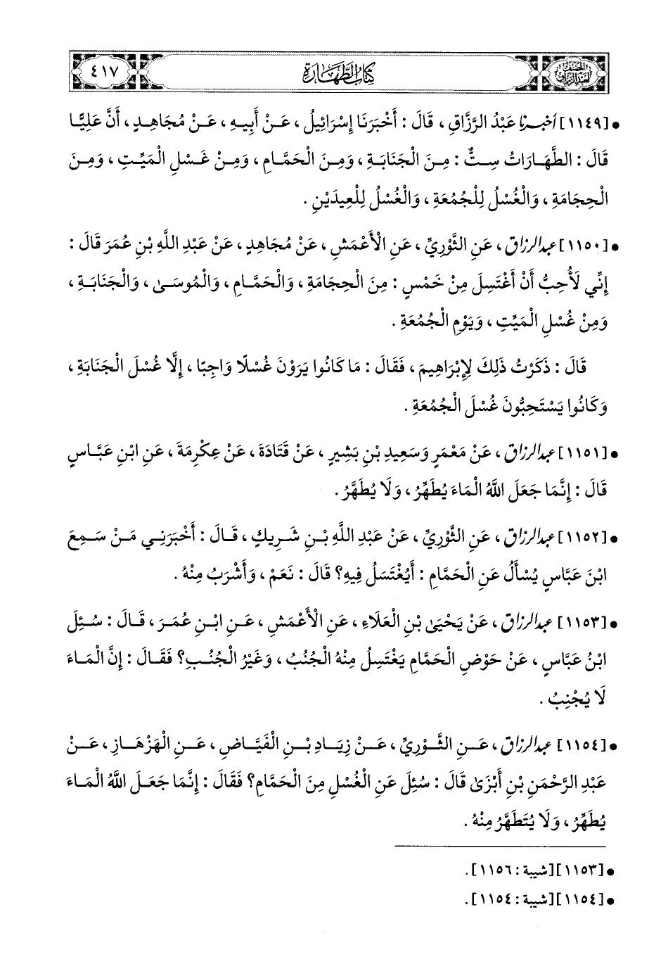 1153- عبد الرزاق، عَن يَحيَى بنِ الْعَلاَءِ، عَنِ الأَعمَشِ، عَنِ ابْنِ عُمَرَ، قَالَ: سُئِلَ ابْنُ عَبَّاسٍ عَن حَوْضِ الْحَمَّامِ يَغْتَسِلُ مِنْهُ الْجُنُبُ وَغَيْرُ الْجُنُبُ، فَقَالَ: إِنَّ المَاءَ لاَ يُجْنِبُ.