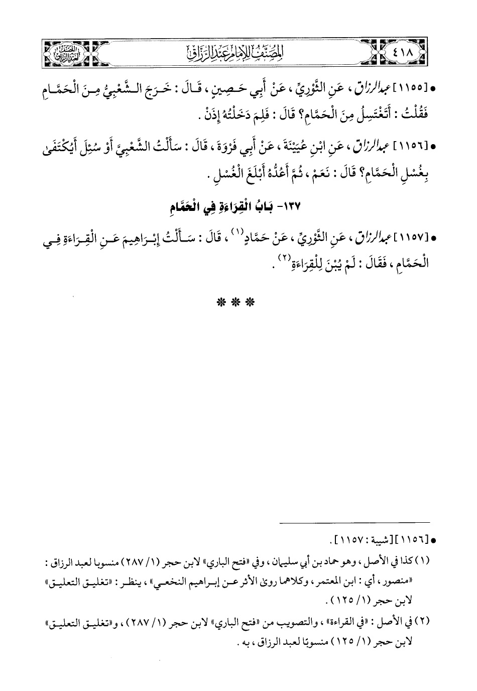 1157- عبد الرزاق، عَنِ الثَّورِيِّ، عَن حَمَّادٍ قَالَ: سَأَلْتُ إِبرَاهِيمَ عَنِ الْقِرَاءَةِ فِي الْحَمَّامِ، فَقَالَ: لَمْ يُبْنَ لِلْقِرَاءَةِ.