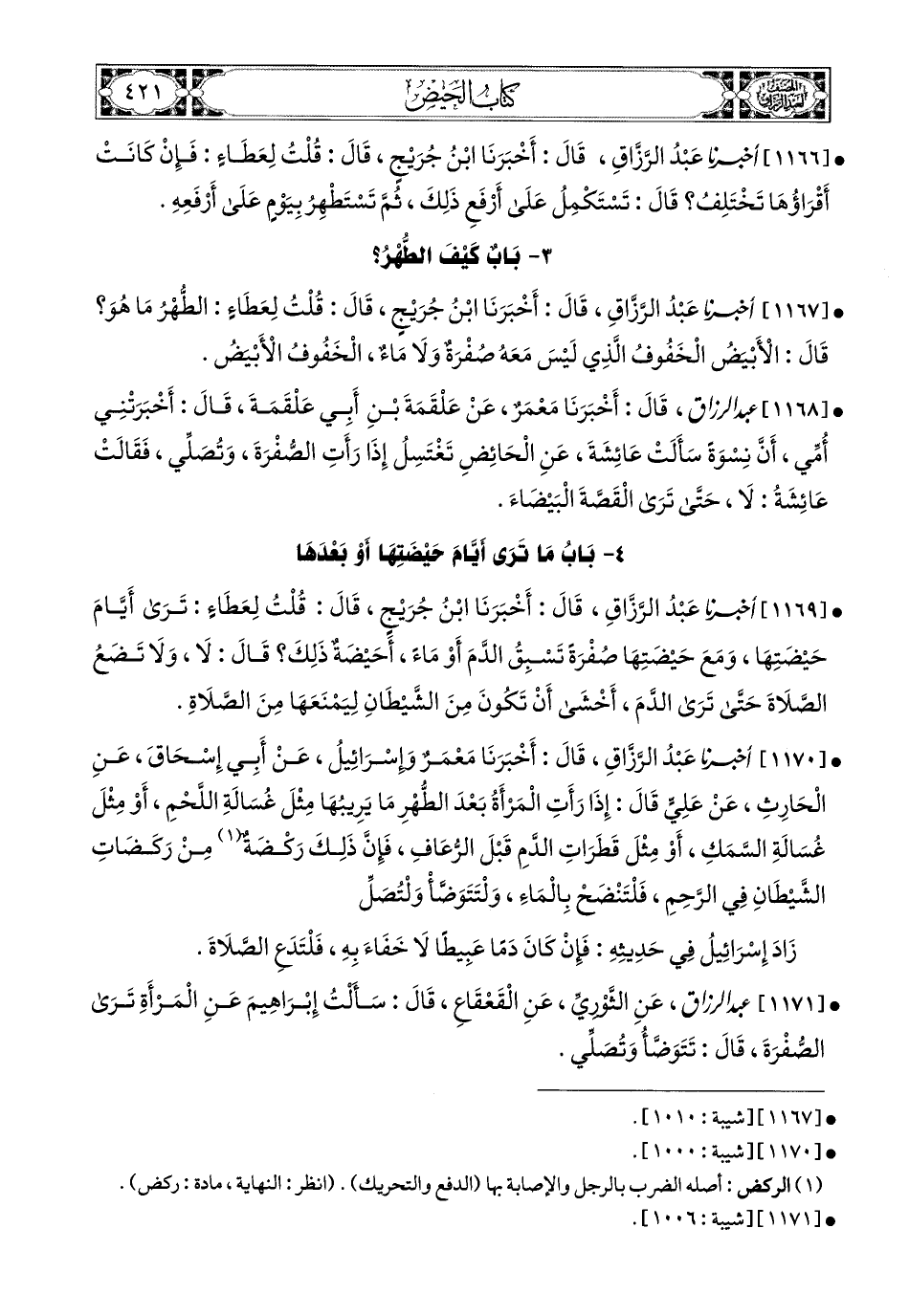 1169- أخبرنا عبد الرزاق، قَالَ: أَخْبَرَنَا ابْنُ جُرَيْجٍ، قَالَ: قُلْتُ لِعَطَاءٍ: تَرَى أَيَّامَ حَيْضَتِهَا وَمَعَ حَيْضَتِهَا صُفْرَةً تَسْبِقُ الدَّمَ، أَوْ مَاءٌ، أَحَيْضَةٌ ذَلِكَ؟ قَالَ: لاَ، وَلاَ تَضَعُ الصَّلاَةَ حَتَّى تَرَى الدَّمَ، أَخْشَى أَنْ تَكُونَ مِنَ الشَّيْطَانِ لِيَمْنَعَهَا مِنَ الصَّلاَةِ.