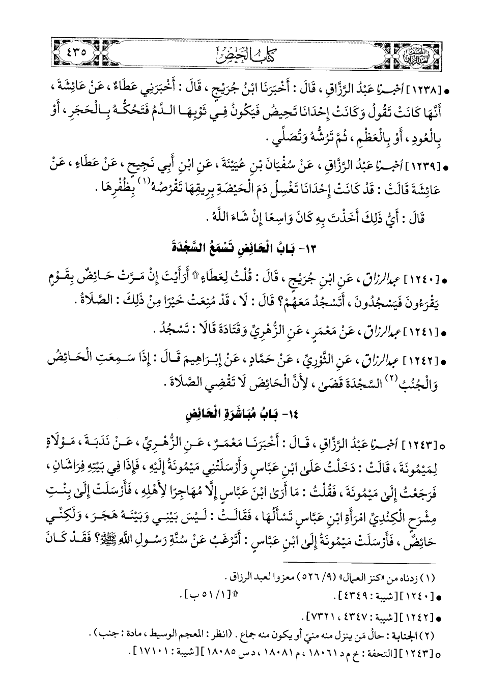 1243- أخبرنا عبد الرزاق، قَالَ: أَخْبَرَنَا مَعْمَرٌ، عَنِ الزُّهْرِيِّ، عَن نَدَبَةَ، مَوْلاَةٍ لِمَيْمُونَةَ، قَالَتْ: دَخَلْتُ عَلَى ابْنِ عَبَّاسٍ، وَأَرْسَلَتْنِي مَيْمُونَةُ إِلَيْهِ، فَإِذَا فِي بَيْتِهِ فِرَاشَانِ، فَرَجَعْتُ إِلَى مَيْمُونَةَ، فَقُلْتُ: مَا أَرَى ابْنَ عَبَّاسٍ إِلاَّ مُهَاجِرًا لأَهْلِهِ، فَأَرْسَلَتْ إِلَى بِنْتِ مِشْرَحٍ الْكِنْدِيِّ، امْرَأَةِ ابْنِ عَبَّاسٍ تَسْأَلُهَا، فَقَالَتْ: لَيْسَ بَيْنِي وَبَيْنَهُ هَجَرَ، وَلَكِنِّي حَائِضٌ، فَأَرْسَلَتْ مَيْمُونَةُ إِلَى ابْنِ عَبَّاسٍ: أَتَرْغَبُ عَن سُنَّةِ رَسُولِ اللهِ صَلَّى اللهُ عَلَيْهِ وَسَلَّمَ؟ فَقَدْ كَانَ رَسُولُ اللهِ صَلَّى اللهُ عَلَيْهِ وَسَلَّمَ يُبَاشِرُ المَرْأَةَ مِنْ نِسَائِهِ حَائِضًا تَكُونُ عَلَيْهَا الْخِرْقَةُ إِلَى الرُّكْبَةِ، أَوْ إِلَى نِصْفِ الْفَخِذِ.