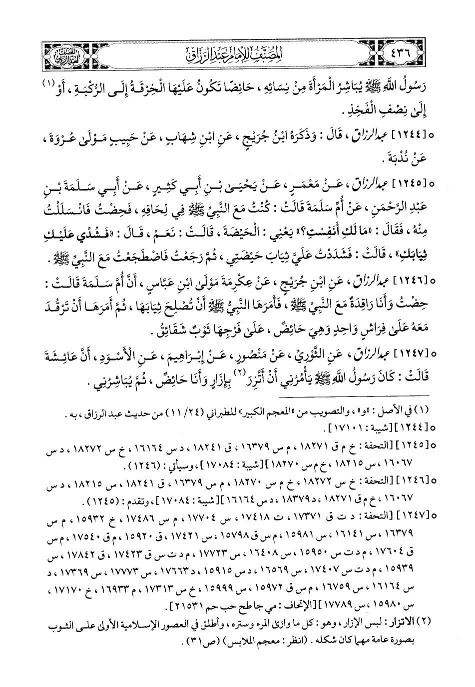 1247- عبد الرزاق، عَنِ الثَّورِيِّ، عَنْ مَنصُورٍ، عَن إِبرَاهِيمَ، عَنِ الأَسْوَدِ، أَنَّ عَائِشَةَ قَالَتْ: كَانَ رَسُولُ اللهِ صَلَّى اللهُ عَلَيْهِ وَسَلَّمَ يَأْمُرُنِي أَنْ أَتَّزِرَ بِإِزَارٍ وَأَنَا حَائِضٌ، ثُمَّ يُبَاشِرُنِي.