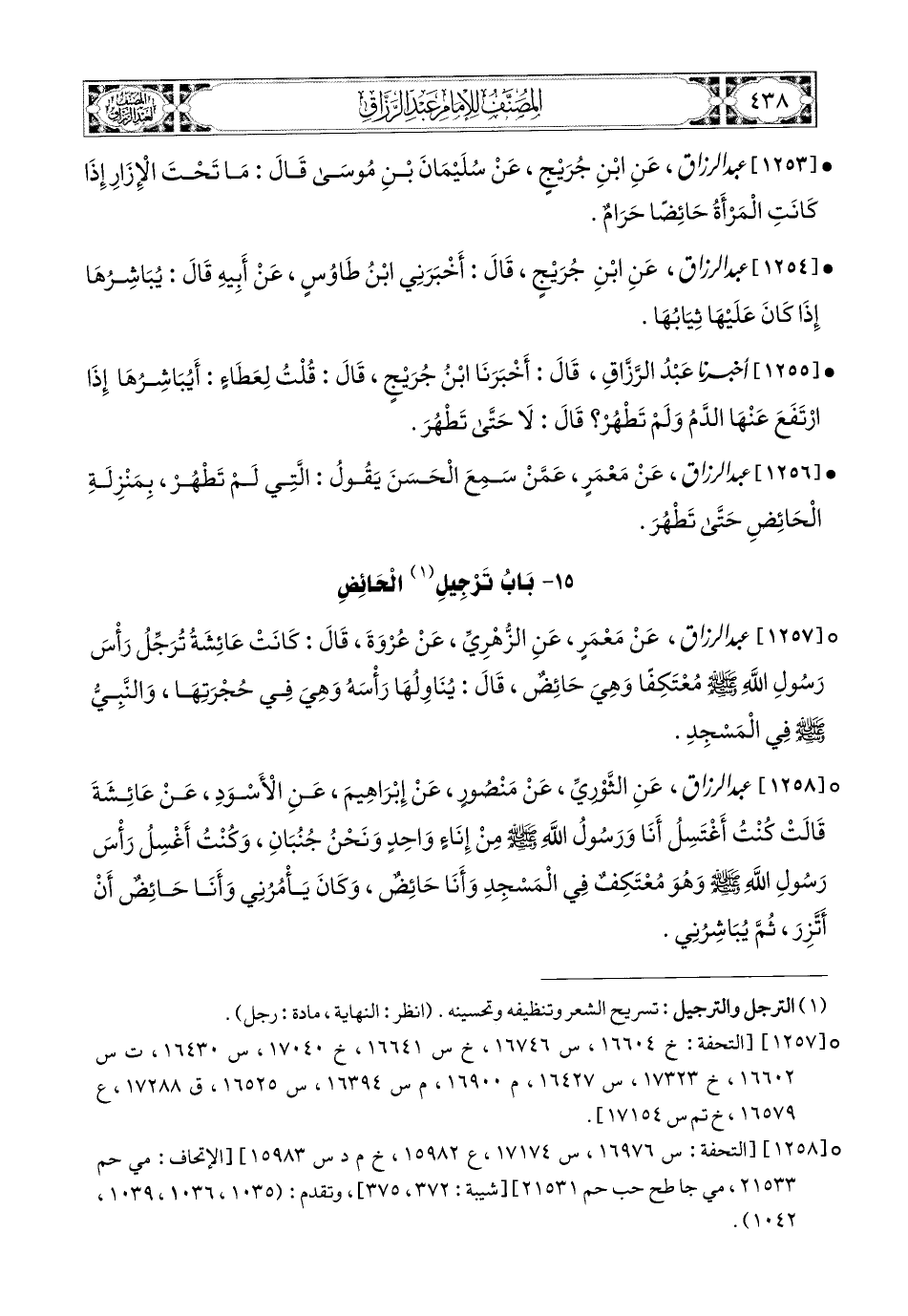1257- عبد الرزاق، عَنْ مَعْمَرٍ، عَنِ الزُّهْرِيِّ، عَن عُرْوَةَ قَالَ: كَانَتْ عَائِشَةُ تُرَجِّلُ رَأْسَ رَسُولِ اللهِ صَلَّى اللهُ عَلَيْهِ وَسَلَّمَ مُعْتَكِفًا وَهِيَ حَائِضٌ، قَالَ: يُنَاوِلُهَا رَأْسَهُ وَهِيَ فِي حُجْرَتِهَا، وَالنَّبِيُّ صَلَّى اللهُ عَلَيْهِ وَسَلَّمَ فِي المَسْجِدِ.
