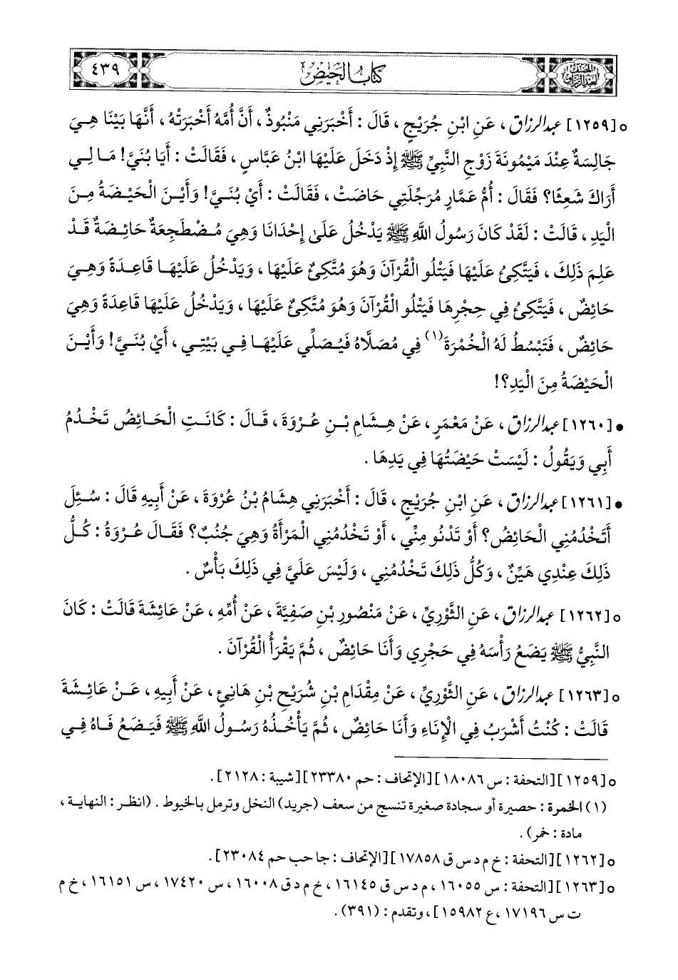 1262- عبد الرزاق، عَنِ الثَّورِيِّ، عَنْ مَنصُورِ بْنِ صَفِيَّةَ، عَن أُمِّهِ، عَنْ عَائِشَةَ، قَالَتْ: كَانَ النَّبِيُّ صَلَّى اللهُ عَلَيْهِ وَسَلَّمَ يَضَعُ رَأْسَهُ فِي حَجْرِي وَأَنَا حَائِضٌ، ثُمَّ يَقْرَأُ الْقُرْآنَ.