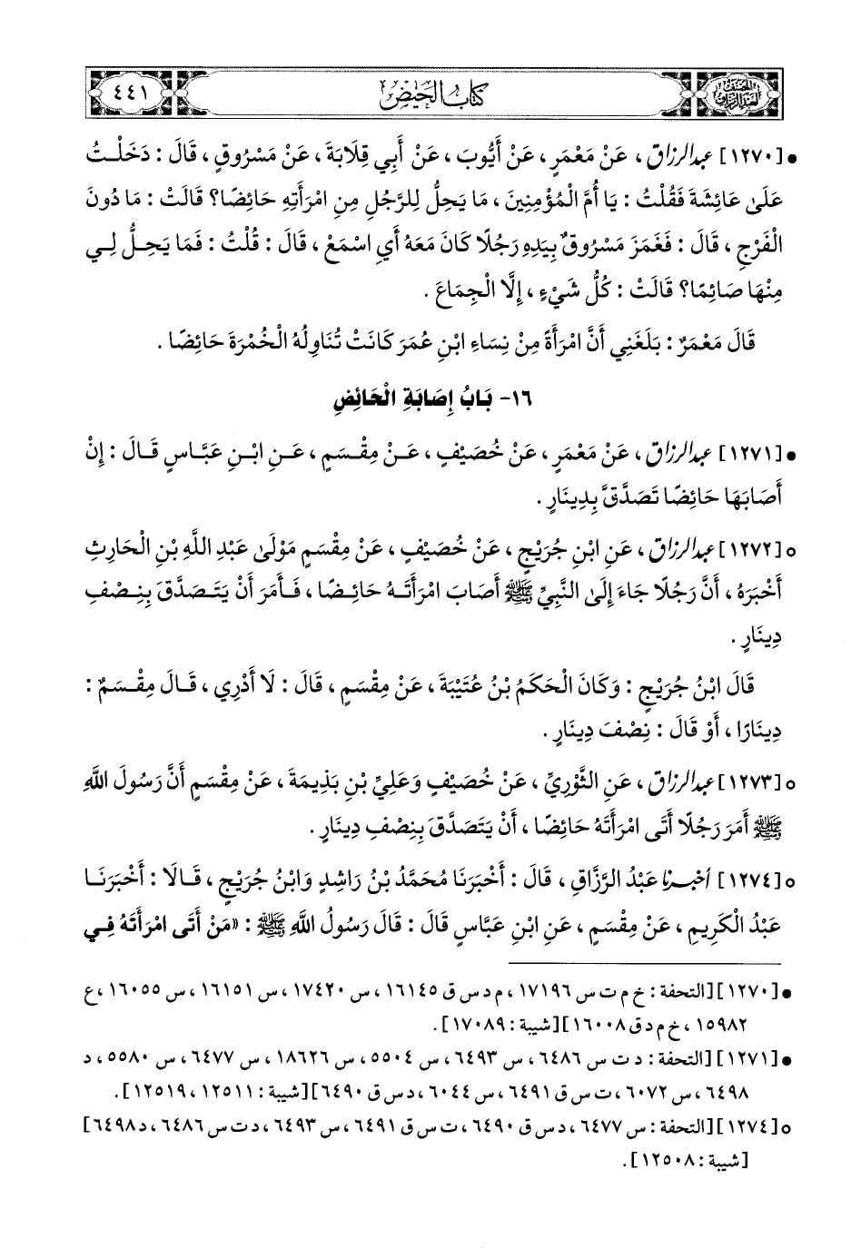1272- عبد الرزاق، عَنِ ابْنِ جُرَيْجٍ، عَن خُصَيْفٍ، عَن مِقْسَمٍ، مَوْلَى عَبدِ اللهِ بْنِ الْحَارِثِ أَخْبَرَهُ، أَنَّ رَجُلاً جَاءَ إِلَى النَّبِيِّ صَلَّى اللهُ عَلَيْهِ وَسَلَّمَ أَصَابَ امْرَأَتَهُ حَائِضًا، فَأَمَرَ أَنْ يَتَصَدَّقَ بِنِصْفِ دِينَارٍ.