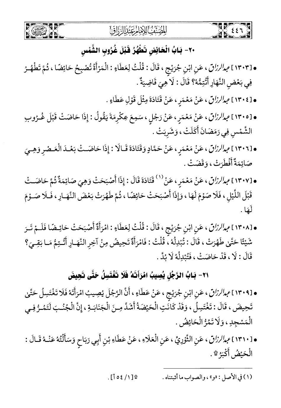 1303- عبد الرزاق، عَنِ ابْنِ جُرَيْجٍ، قَالَ: قُلْتُ لِعَطَاءٍ: المَرْأَةُ تُصْبِحُ حَائِضًا، ثُمَّ تَطْهُرُ فِي بَعْضِ النَّهَارِ أَتُتِمُّهُ؟ قَالَ: لاَ هِيَ قَاضِيَةٌ.