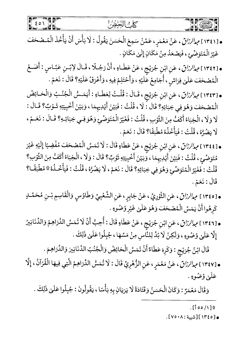 1347- عبد الرزاق، عَنْ مَعْمَرٍ، عَنِ الزُّهْرِيِّ، قَالَ: لاَ تُمَسُّ الدَّرَاهِمُ الَّتِي فِيهَا الْقُرْآنُ إِلاَّ عَلَى وُضُوءٍ.