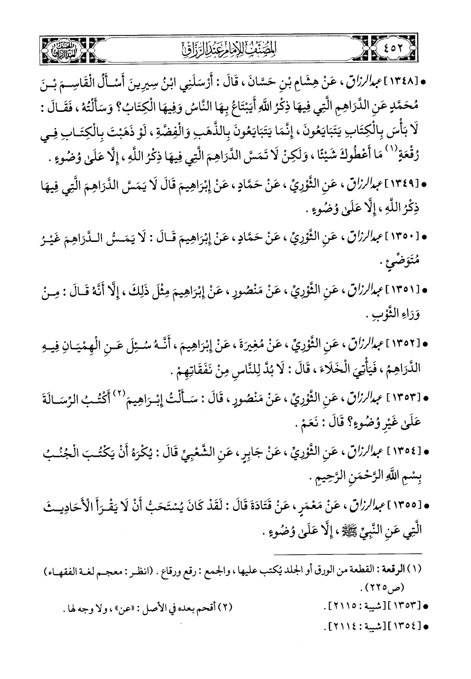 1350- عبد الرزاق، عَنِ الثَّورِيِّ، عَن حَمَّادٍ، عَن إِبرَاهِيمَ، قَالَ: لاَ يَمَسُّ الدَّرَاهِمَ غَيْرُ مُتَوَضِّئٍ.