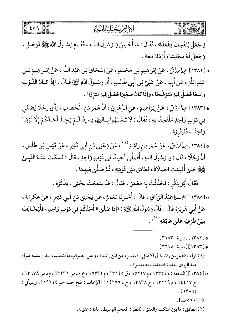 1383- عبد الرزاق، عَن إِبرَاهِيمَ، عَنِ الزُّهْرِيِّ، أَنَّ عُمَرَ بن الْخَطَّابِ رَأَى رَجُلاً يُصَلِّي فِي ثَوْبٍ وَاحِدٍ، مُلْتَحِفًا بِهِ، فَقَالَ: لاَ تَشَبَّهَوَا بِالْيَهُودِ، إِذَا لَمْ يَجِدْ أَحَدُكُمْ إِلاَّ ثَوْبًا وَاحِدًا فَلْيَتَّزِرْهُ.