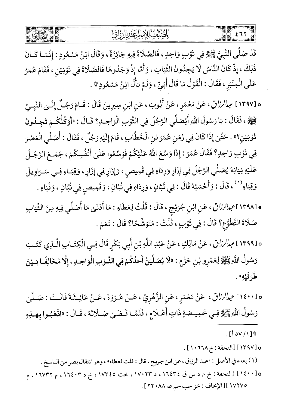 1397- عبد الرزاق، عَنْ مَعْمَرٍ، عَنْ أَيُّوبَ، عَنِ ابْنِ سِيرِينَ، قَالَ: قَامَ رَجُلٌ إِلَى النَّبِيِّ صَلَّى اللهُ عَلَيْهِ وَسَلَّمَ، فَقَالَ: يَا رَسُولَ اللهِ، أَيُصَلِّي الرَّجُلُ فِي الثَّوْبِ الْوَاحِدِ؟ قَالَ: أَوَكُلُّكُمْ تَجِدُونَ ثَوْبَيْنِ؟ حَتَّى إِذَا كَانَ فِي زَمَنِ عُمَرَ بْنِ الْخَطَّابِ، قَامَ إِلَيْهِ رَجُلٌ، فَقَالَ: أُصَلِّي الْعَصْرَ فِي ثَوْبٍ وَاحِدٍ؟ فَقَالَ عُمَرُ: إِذَا وَسَّعَ اللهُ عَلَيْكُمْ، فَوَسِّعُوَا عَلَى أَنْفُسِكُمْ، جَمَعَ الرَّجُلُ عَلَيْهِ ثِيَابَهُ، يُصَلِّي الرَّجُلُ فِي إِزَارٍ وَرِدَاءٍ، فِي قَمِيصٍ، وَإِزَارٍ فِي إِزَارٍ، وَقِبَاءٍ فِي سَرَاوِيلَ، وَقِبَاءٍ قَالَ: وَأَحْسَبُهُ قَالَ: فِي تُبَّانٍ وَرِدَاءٍ، فِي تُبَّانٍ وَقَمِيصٍ، فِي تُبَّانٍ وَقِبَاءٍ.