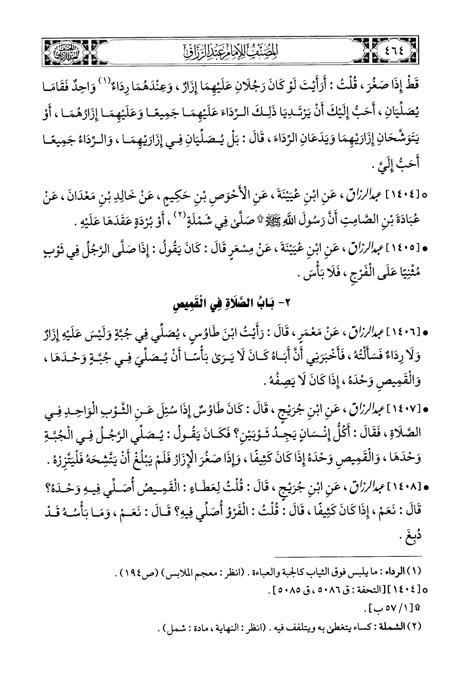 1404- عبد الرزاق، عَنِ ابْنِ عُيَيْنَةَ، عَنِ الأَحْوَصِ بْنِ حَكِيمِ، عَن خَالِدِ بْنِ مَعْدَانَ، عَن عُبَادَةَ بْنِ صَامِتٍ؛ أَنَّ رَسُولَ اللهِ صَلَّى اللهُ عَلَيْهِ وَسَلَّمَ صَلَّى فِي شَمْلَةٍ، أَوْ بُرْدَةٍ عَقَدَهَا عَلَيْهِ.