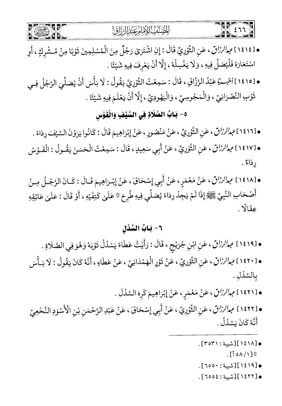 1416- عبد الرزاق، عَنِ الثَّورِيِّ، عَنْ مَنصُورٍ، عَن إِبرَاهِيمَ، قَالَ: كَانَوَا يَرَوْنَ السَّيْفَ رِدَاءً.