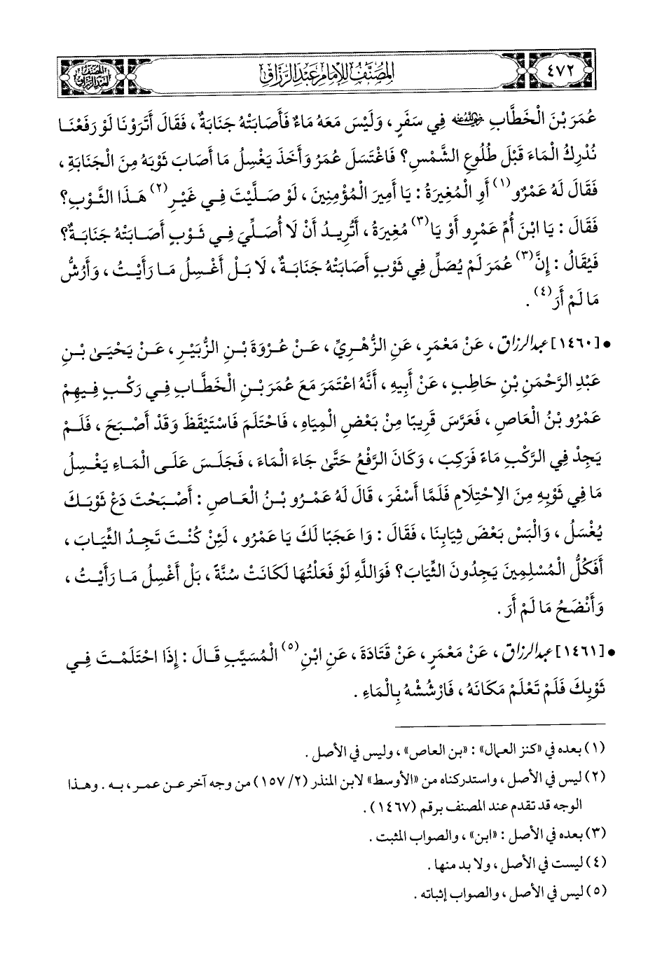 1460- عبد الرزاق، عَنْ مَعْمَرٍ، عَنِ الزُّهْرِيِّ، عَن عُرْوَةَ بْنِ الزُّبَيْرِ، عَن يَحيَى بنِ عَبدِ الرَّحْمَنِ بْنِ حَاطِبٍ، عَنْ أَبِيهِ؛ أَنَّهُ اعْتَمَرَ مَعَ عُمَرَ بْنِ الْخَطَّابِ فِي رَكْبٍ، فِيهِمْ عَمْرُو بن الْعَاصِ، فَعَرَّسَ قَرِيبًا مِنْ بَعْضِ المِيَاهِ، فَاحْتَلَمَ، فَاسْتَيْقَظَ وَقَدْ أَصْبَحَ، فَلَمْ يَجِدْ فِي الرَّكْبِ مَاءً فَرَكِبَ، وَكَانَ الرَّفْعُ حَتَّى جَاءَ المَاءَ، فَجَلَسَ عَلَى المَاءِ يَغْسِلُ مَا فِي ثَوْبِهِ مِنَ الاِحْتِلاَمِ، فَلَمَّا أَسْفَرَ، قَالَ لَهُ عَمْرُو بن الْعَاصِ: أَصْبَحْتَ، دَعْ ثَوْبَكَ يُغْسَلُ، وَالْبَسْ بَعْضَ ثِيَابِنَا، فَقَالَ: وَا عَجَبًا لَكَ يَا عَمْرُو، لَئِنْ كُنْتَ تَجِدُ الثِّيَابَ، أَفَكُلُّ المُسْلِمِينَ يَجِدُونَ الثِّيَابَ؟ فَوَاللهِ لَوْ فَعَلْتُهَا لَكَانَتْ سُنَّةً، بَلِ أَغْسِلُ مَا رَأَيْتُ، وَأَنْضَحُ مَا لَمْ أَرَ.