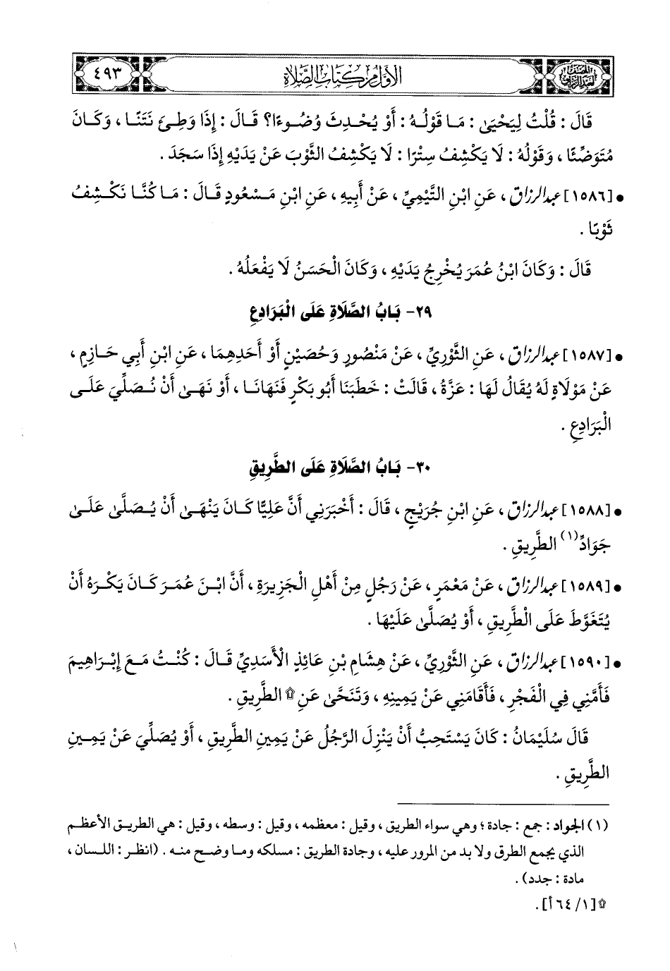 1588- عبد الرزاق، عَنِ ابْنِ جُرَيْجٍ، قَالَ: أَخْبَرَنِي أَنَّ عَلِيًّا كَانَ يَنْهَى أَنْ يُصَلَّى عَلَى جَوَادِّ الطَّرِيقِ.