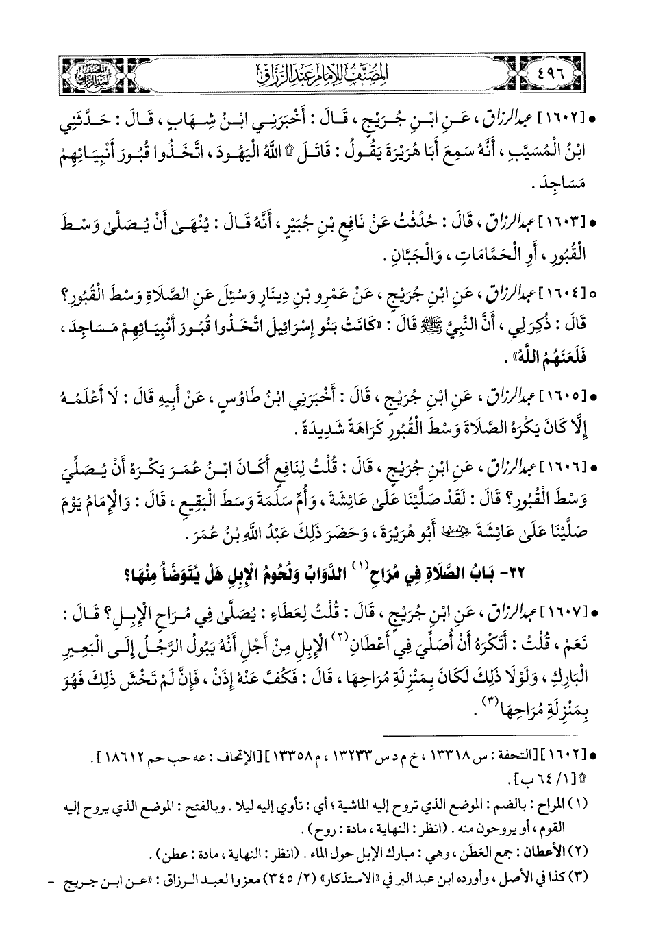 1604- عبد الرزاق، عَنِ ابْنِ جُرَيْجٍ، عَنْ عَمْرِو بنِ دِينَارٍ، وَسُئِلَ عَنِ الصَّلاَةِ وَسَطَ الْقُبُورِ؟ قَالَ: ذُكِرَ لِي أَنَّ النَّبِيَّ صَلَّى اللهُ عَلَيْهِ وَسَلَّمَ قَالَ: كَانَتْ بَنُو إِسْرَائِيلَ اتَّخَذُوا قُبُوَرَ أَنْبِيَائِهِمْ مَسَاجِدَ، فَلَعَنَهُمُ اللهُ.
