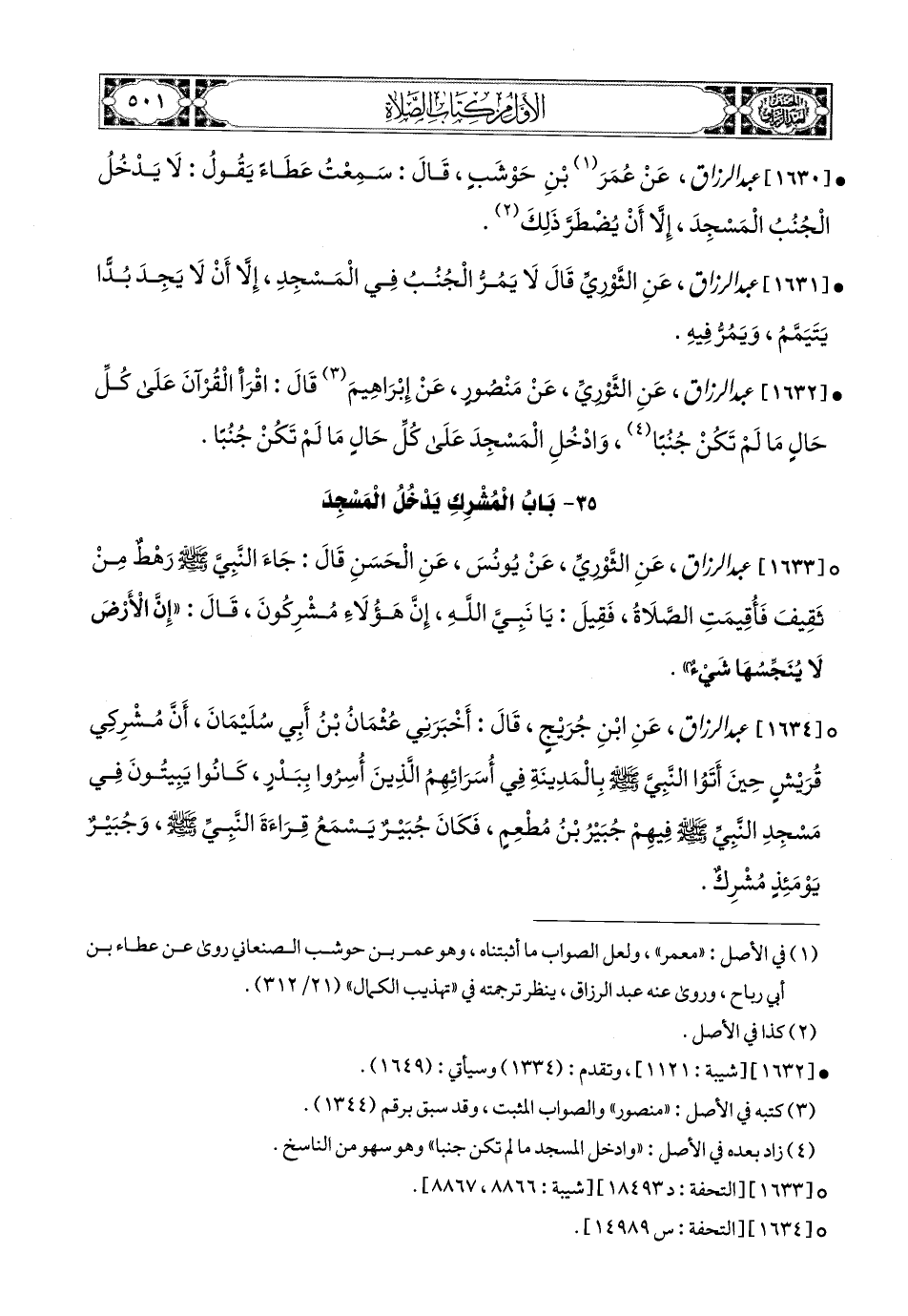 1630- عبد الرزاق، عَنْ عُمَرَ بْنَ حَوْشَبٍ (1)، قَالَ: سَمِعْتُ عَطَاءً يَقُولُ: لاَ يَدْخُلُ الْجُنُبُ المَسْجِدَ إِلاَّ أَنْ يُضْطَرَّ ذَلِكَ.