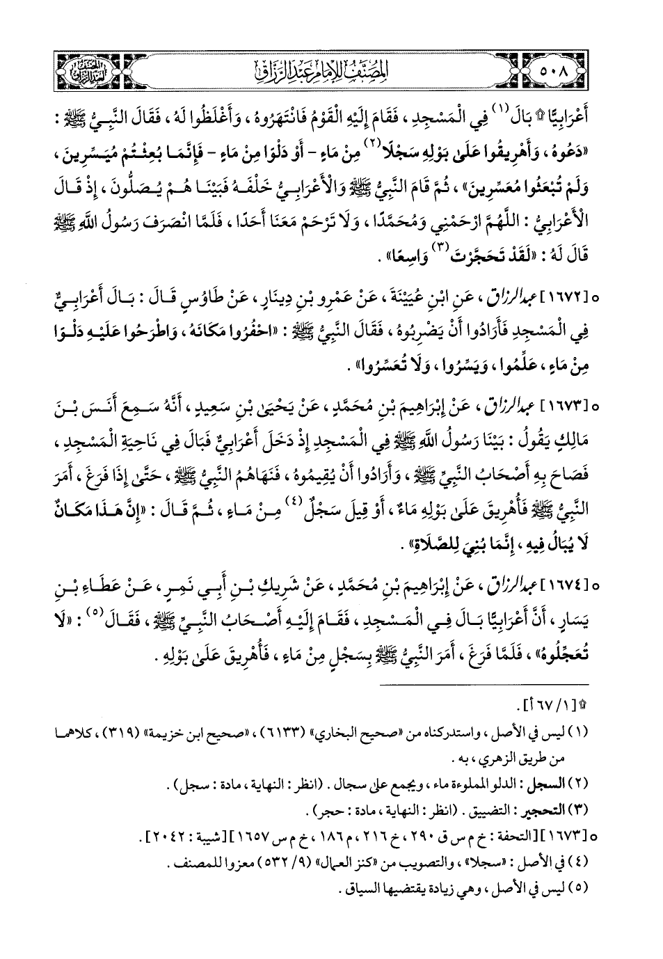 1673- عبد الرزاق، عَن إِبرَاهِيمَ بْنِ مُحَمَّدٍ، عَن يَحيَى بنِ سَعيدٍ، أَنَّهُ سَمِعَ أَنَسَ بن مَالِكٍ يَقُولُ: بَيْنَا رَسُولُ اللهِ صَلَّى اللهُ عَلَيْهِ وَسَلَّمَ فِي المَسْجِدِ، إِذْ دَخَلَ أَعْرَابِيٌّ فَبَالَ فِي نَاحِيَةِ المَسْجِدِ، فَصَاحَ بِهِ أَصْحَابُ النَّبِيِّ صَلَّى اللهُ عَلَيْهِ وَسَلَّمَ، وَأَرَادُو أَنْ يُقِيمُوهُ، فَنَهَاهُمُ النَّبِيُّ صَلَّى اللهُ عَلَيْهِ وَسَلَّمَ، حَتَّى إِذَا فَرَغَ، أَمَرَ النَّبِيُّ صَلَّى اللهُ عَلَيْهِ وَسَلَّمَ فَأُهَرِيقَ عَلَى بَوْلِهِ مَاءٌ، أَوْ قِيلَ: سَجْلٌ مِنْ مَاءٍ، ثُمَّ قَالَ: إِنَّ هَذَا مَكَانٌ لاَ يُبَالُ فِيهِ إِنَّمَا بُنِيَ لِلصَّلاَةِ.