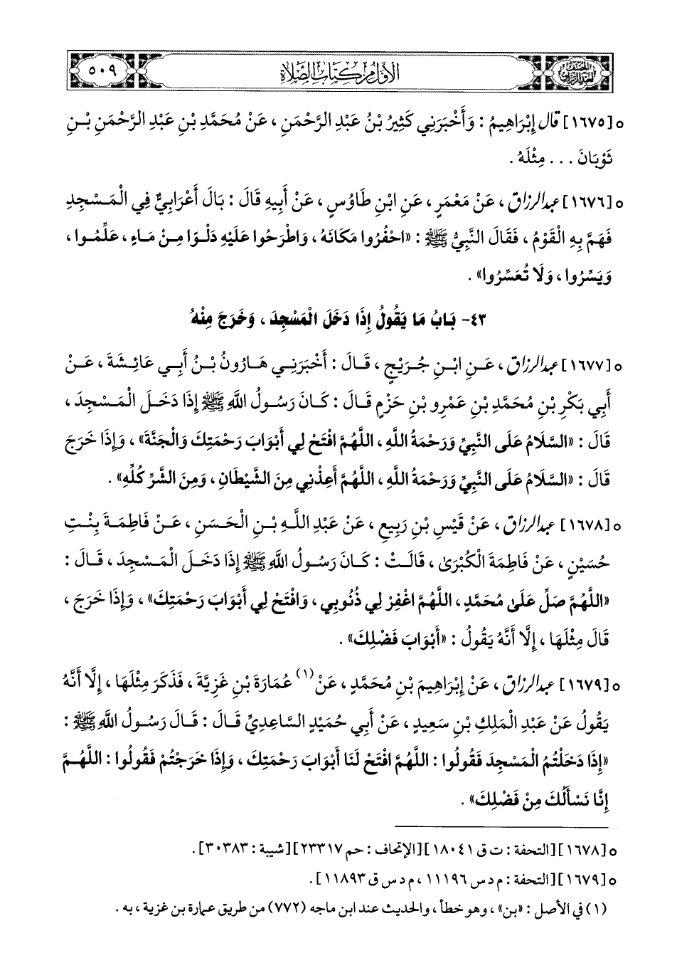 1677- عبد الرزاق، عَنِ ابْنِ جُرَيْجٍ، قَالَ: أَخْبَرَنِي هَارُونُ بن أَبِي عَائِشَةَ، عَنْ أَبِي بَكْرِ بْنِ مُحَمَّدِ بْنِ عَمْرِو بنِ حَزْمٍ قَالَ: كَانَ رَسُولُ اللهِ صَلَّى اللهُ عَلَيْهِ وَسَلَّمَ إِذَا دَخَلَ المَسْجِدَ قَالَ: السَّلاَمُ عَلَى النَّبِيِّ وَرَحْمَةُ اللهِ، اللهُمَ افْتَحْ لِي أَبْوَابَ رَحْمَتِكَ وَالْجَنَّةَ، وَإِذَا خَرَجَ قَالَ: السَّلاَمُ عَلَى النَّبِيِّ وَرَحْمَةُ اللهِ، اللَّهُمَّ أَعِذْنِي مِنَ الشَّيْطَانِ، وَمِنَ الشَّرِّ كُلِّهِ.