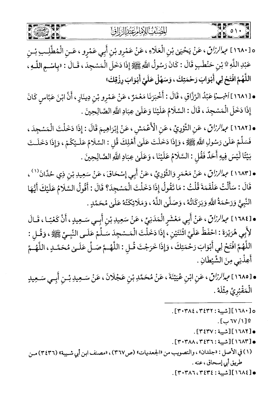 1683- عبد الرزاق، عَنْ مَعْمَرٍ، وَالثَّورِيِّ، عَنْ أَبِي إِسْحَاقَ، عَن سَعيدِ بْنِ ذِي حُدَّانَ قَالَ: سَأَلْتُ عَلْقَمَةَ، قُلْتُ: مَا تَقُولُ إِذَا دَخَلْتَ المَسْجِدَ؟ قَالَ: أَقُولُ السَّلاَمُ عَلَيْكَ أَيُّهَا النَّبِيُّ وَرَحْمَةُ اللهِ وَبَرَكَاتُهُ، وَصَلَّى اللهُ وَمَلاَئِكَتُهُ عَلَى مُحَمَّدٍ.