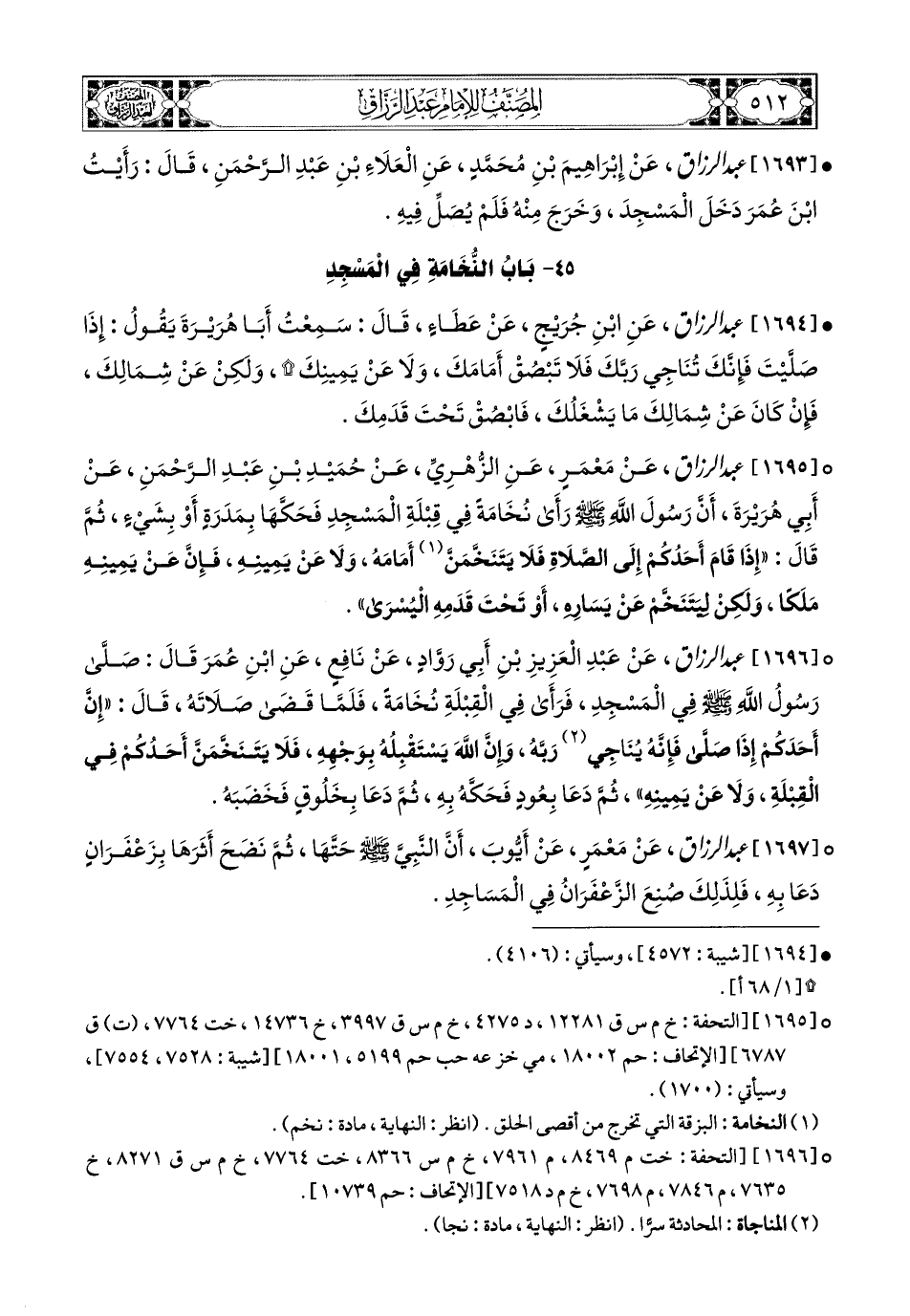 1696- عبد الرزاق، عَنْ عَبدِ الْعَزِيزِ بْنِ أَبِي رَوَّادٍ، عَن نَافِعٍ، عَنِ ابْنِ عُمَرَ، قَالَ: صَلَّى رَسُولُ اللهِ صَلَّى اللهُ عَلَيْهِ وَسَلَّمَ فِي المَسْجِدِ، فَرَأَى فِي الْقِبْلَةِ نُخَامَةً، فَلَمَّا قَضَى صَلاَتَهُ قَالَ: إِنَّ أَحَدَكُمْ إِذَا صَلَّى فَإِنَّهُ يُنَاجِي رَبَّهُ، وَإِنَّ اللهَ يَسْتَقْبِلُهُ بِوَجْهِهِ، فَلاَ يَتَنَخَّمَنَّ أَحَدُكُمْ فِي الْقِبْلَةِ، وَلاَ عَن يَمِينِهِ، ثُمَّ دَعَا بِعُودٍ فَحَكَّهُ بِهِ، ثُمَّ دَعَا بِخَلُوقٍ فَخَضبُهُ.