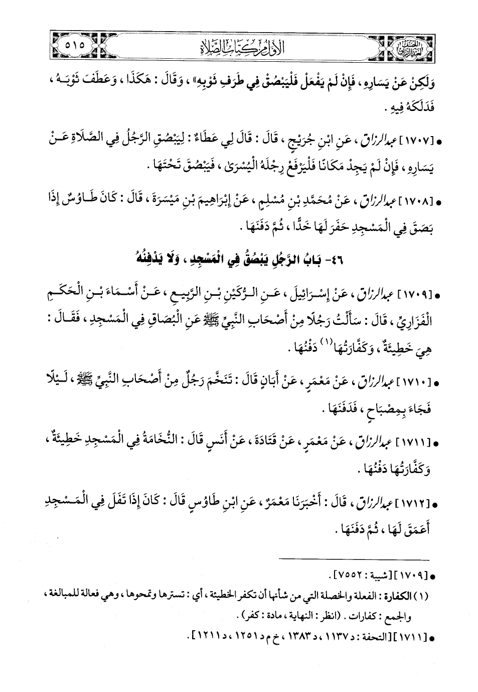 1711- عبد الرزاق، عَنْ مَعْمَرٍ، عَن قَتَادَةَ، عَنْ أَنَسٍ قَالَ: النُّخَامَةُ فِي المَسْجِدِ خَطِيئَةٌ، وَكَفَّارَتُهَا دَفْنُهَا.