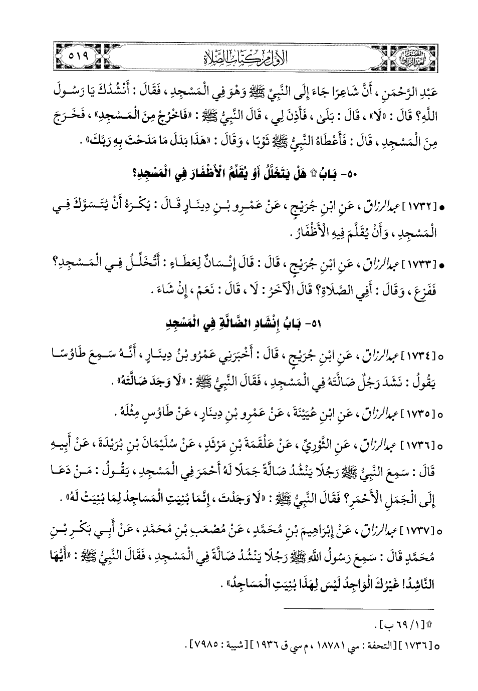 1737- عبد الرزاق، عَن إِبرَاهِيمَ بْنِ مُحَمَّدٍ، عَن مُصْعَبِ بْنِ مُحَمَّدٍ، عَنْ أَبِي بَكْرِ بْنِ مُحَمَّدٍ، قَالَ: سَمِعَ رَسُولُ اللهِ صَلَّى اللهُ عَلَيْهِ وَسَلَّمَ رَجُلاً يَنْشُدُ ضَالَّةً فِي المَسْجِدِ، فَقَالَ النَّبِيُّ صَلَّى اللهُ عَلَيْهِ وَسَلَّمَ: أَيُّهَا النَّاشِدُ غَيْرُكَ الْوَاجِدُ، لَيْسَ لِهَذَا بُنِيَتِ المَسَاجِدُ.