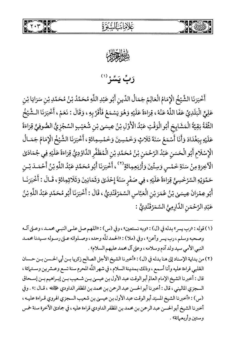 أخبرنا الشيخ الإمام العالم, جمال الدين أبو عبد الله, محمد بن محمد بن سرايا بن علي البلدي, عفا الله عنه, قراءة عليه وهو يسمع فأقر به, وقال: نعم, أخبرنا الشيخ الثقة بقية المشايخ أبو الوقت عبد الأول بن عيسى بن شعيب السجزي الصوفي قراءة عليه ببغداد, وأنا أسمع, سنة ثلاث وخمسين وخمس مئة, أخبرنا الشيخ الإمام جمال الإسلام أبو الحسن عبد الرحمن بن محمد بن المظفر الداودي, قراءة عليه في جمادى الآخرة من سنة خمس وستين وأربع مئة, أخبرنا أبو محمد عبد الله بن أحمد بن حمويه السرخسي قراءة عليه في صفر سنة إحدى وثمانين وثلاث مِئة, قال: أخبرنا أبو عمران عيسى بن عمر بن العباس السمرقندي, قال: أخبرنا أبو محمد عبد الله بن عبد الرحمن الدارمي, السمرقندي.