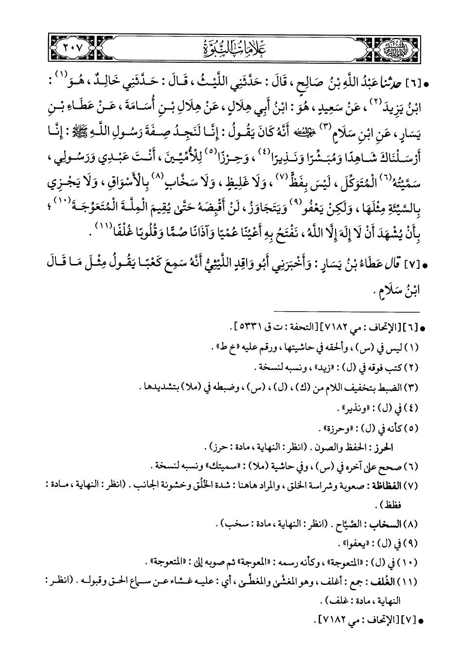 6- حَدَّثَنَا عَبْدُ اللهِ بْنُ صَالِحٍ, قَالَ: حَدَّثَنِي اللَّيْثُ, قَالَ: حَدَّثَنِي خَالِدٌ, هُوَ ابْنُ يَزِيدَ (1), عَنْ سَعِيدٍ, هُوَ ابْنُ أَبِي هِلاَلٍ, عَنْ هِلاَلِ بْنِ أُسَامَةَ, عَنْ عَطَاءِ بْنِ يَسَارٍ, عَنِ ابْنِ سَلاَمٍ رَضِيَ اللهُ عَنْهُ, أَنَّهُ كَانَ يَقُولُ: إِنَّا لَنَجِدُ صِفَةَ رَسُولِ اللهِ صَلى الله عَليهِ وسَلم, إِنَّا أَرْسَلْنَاكَ شَاهِدًا وَمُبَشِّرًا وَنَذِيرًا, وَحِرْزًا لِلأُمِّيِّينَ, أَنْتَ عَبْدِي وَرَسُولِي, سَمَّيْتُهُ الْمُتَوَكِّلَ, لَيْسَ بِفَظٍّ, وَلاَ غَلِيظٍ, وَلاَ سَخَّابٍ (2) بِالأَسْوَاقِ, وَلاَ يَجْزِي بِالسَّيِّئَةِ مِثْلَهَا, وَلَكِنْ يَعْفُو وَيَتَجَاوَزُ, لَنْ أَقْبِضَهُ حَتْى يُقِيمَ الْمِلَّةَ الْمُتَعَوِّجَةَ, بِأَنْ يُشْهَدَ أَنْ لاَ إِلَهَ إِلاَّ اللهُ, نَفْتَحُ بِهِ أَعْيُنًا عُمْيًا, وَآذَانًا صُمًّا, وَقُلُوبًا غُلْفًا.