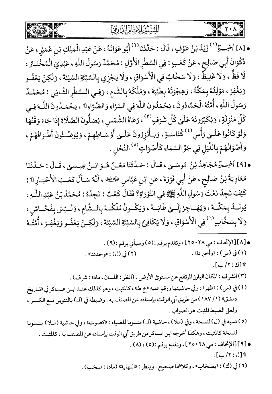 8- أَخبَرَنا زَيْدُ بْنُ عَوْفٍ, قَالَ: حَدَّثَنَا أَبُو عَوَانَةَ, عَنْ عَبْدِ الْمَلِكِ بْنِ عُمَيْرٍ, عَنْ ذَكْوَانَ أَبِي صَالِحٍ, عَنْ كَعْبٍ؛ فِي السَّطْرِ الأَوَّلِ: مُحَمَّدٌ رَسُولُ اللهِ عَبْدِيَ الْمُخْتَارُ, لاَ فَظٌّ, وَلاَ غَلِيظٌ, وَلاَ سَخَّابٌ بِالأَسْوَاقِ, وَلاَ يَجْزِي بِالسَّيِّئَةِ السَّيِّئَةَ, وَلَكِنْ يَعْفُو وَيَغْفِرُ, مَوْلِدُهُ بِمَكَّةَ, وَهِجْرَتُهُ بِطَيْبَةَ, وَمُلْكُهُ بِالشَّامِ, وَفِي السَّطْرِ الثَّانِي: مُحَمَّدٌ رَسُولُ اللهِ أُمَّتُهُ الْحَمَّادُونَ, يَحْمَدُونَ اللهَ فِي السَّرَّاءِ والضَّرَّاءِ, يَحْمَدُونَ اللهَ فِي كُلِّ مَنْزِلَةٍ, وَيُكَبِّرُونَهُ عَلَى كُلِّ شَرَفٍ, رُعَاةُ الشَّمْسِ, يُصَلُّونَ الصَّلاَةَ إِذَا جَاءَ وَقْتُهَا, وَلَوْ كَانُوا عَلَى رَأْسِ كُنَاسَةٍ, وَيَأْتَزِرُونَ عَلَى أَوْسَاطِهِمْ, وَيُوَضِّؤُونَ أَطْرَافَهُمْ, وَأَصْوَاتُهُمْ بِاللَّيْلِ فِي جَوِّ السَّمَاءِ كَأَصواتِ النَّحْلِ.