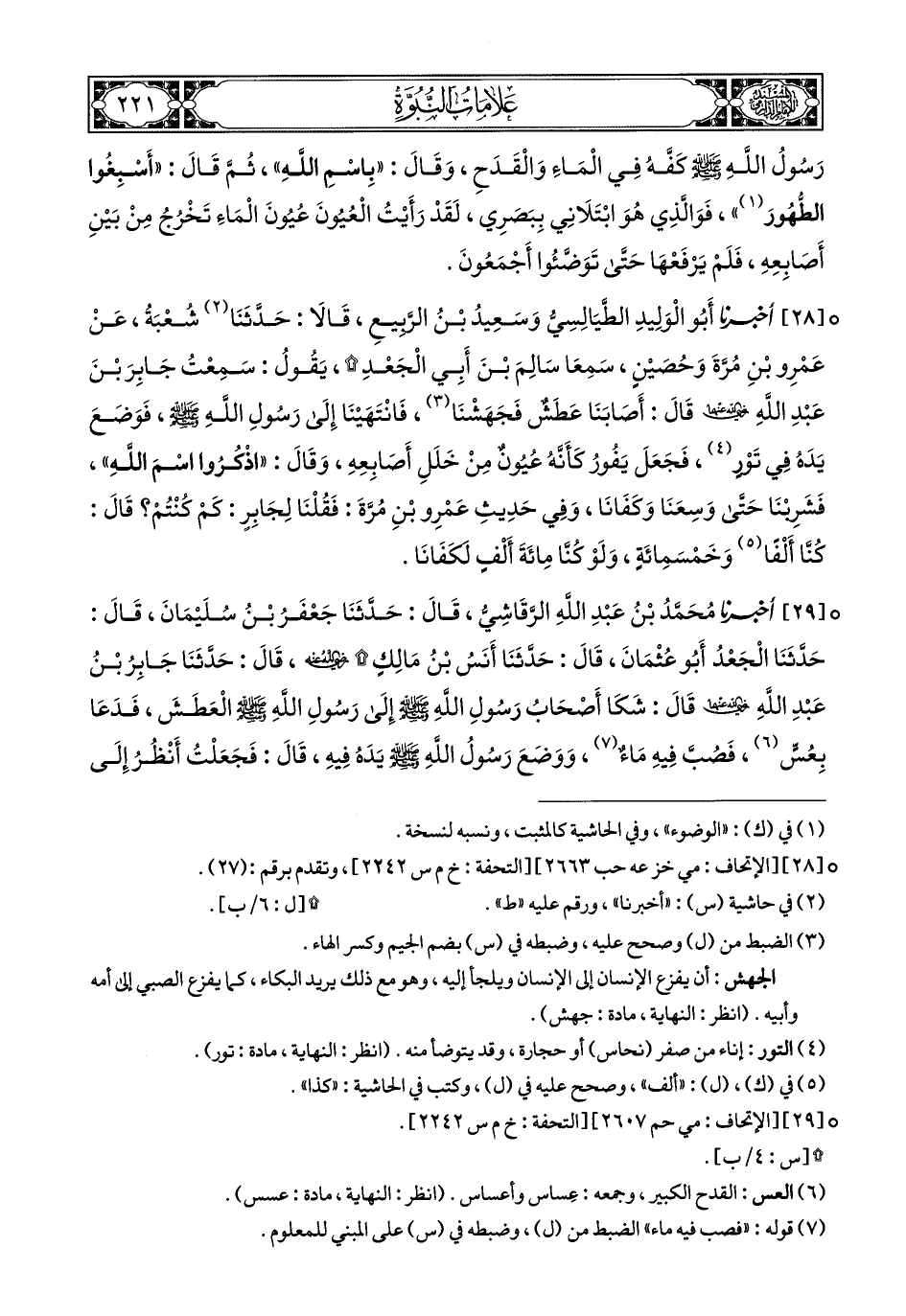 28- أَخبَرَنا أَبُو الْوَلِيدِ الطَّيَالِسِيُّ, وَسَعِيدُ بْنُ الرَّبِيعِ, قَالاَ: حَدَّثَنَا شُعْبَةُ, عَنْ عُمَرِو بْنِ مُرَّةَ, وَحُصَيْنٍ, سَمِعَا سَالِمَ بْنَ أَبِي الْجَعْدِ يَقُولُ: سَمِعْتُ جَابِرَ بْنَ عَبْدِ اللهِ رَضِيَ اللهُ عَنْهُمَا, قَالَ: أَصَابَنَا عَطَشٌ, فَجَهَشْنَا, فَانْتَهَيْنَا إِلَى رَسُولِ اللهِ صَلى الله عَليهِ وسَلم, فَوَضَعَ يَدَهُ فِي تَوْرٍ (1), فَجَعَلَ يَفُورُ كَأَنَّهُ عُيُونٌ مِنْ خَلَلِ (2) أَصَابِعِهِ, وَقَالَ: اذْكُرُوا اسْمَ اللهِ, فَشَرِبْنَا, حَتَّى وَسِعَنَا وَكَفَانَا.