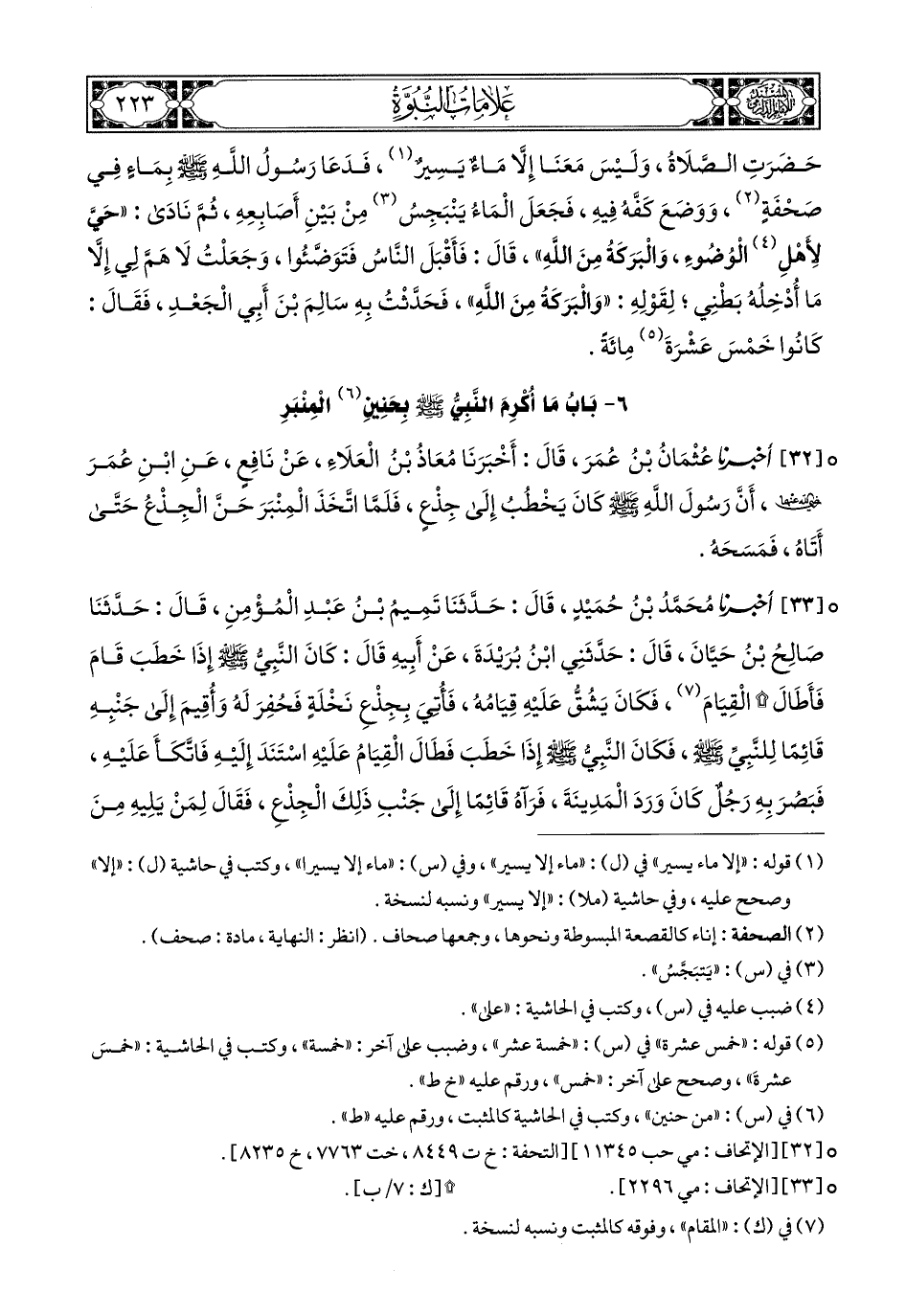32- أَخبَرَنا عُثْمَانُ بْنُ عُمَرَ, قَالَ: أَخبَرَنا مُعَاذُ بْنُ الْعَلاَءِ, عَنْ نَافِعٍ, عَنِ ابْنِ عُمَرَ رَضِيَ اللهُ عَنْهُمَا, أَنَّ رَسُولَ اللهِ صَلى الله عَليهِ وسَلم كَانَ يَخْطُبُ إِلَى جِذْعٍ, فَلَمَّا اتَّخَذَ الْمِنْبَرَ حَنَّ الْجِذْعُ, حَتَّى أَتَاهُ فَمَسَحَهُ.