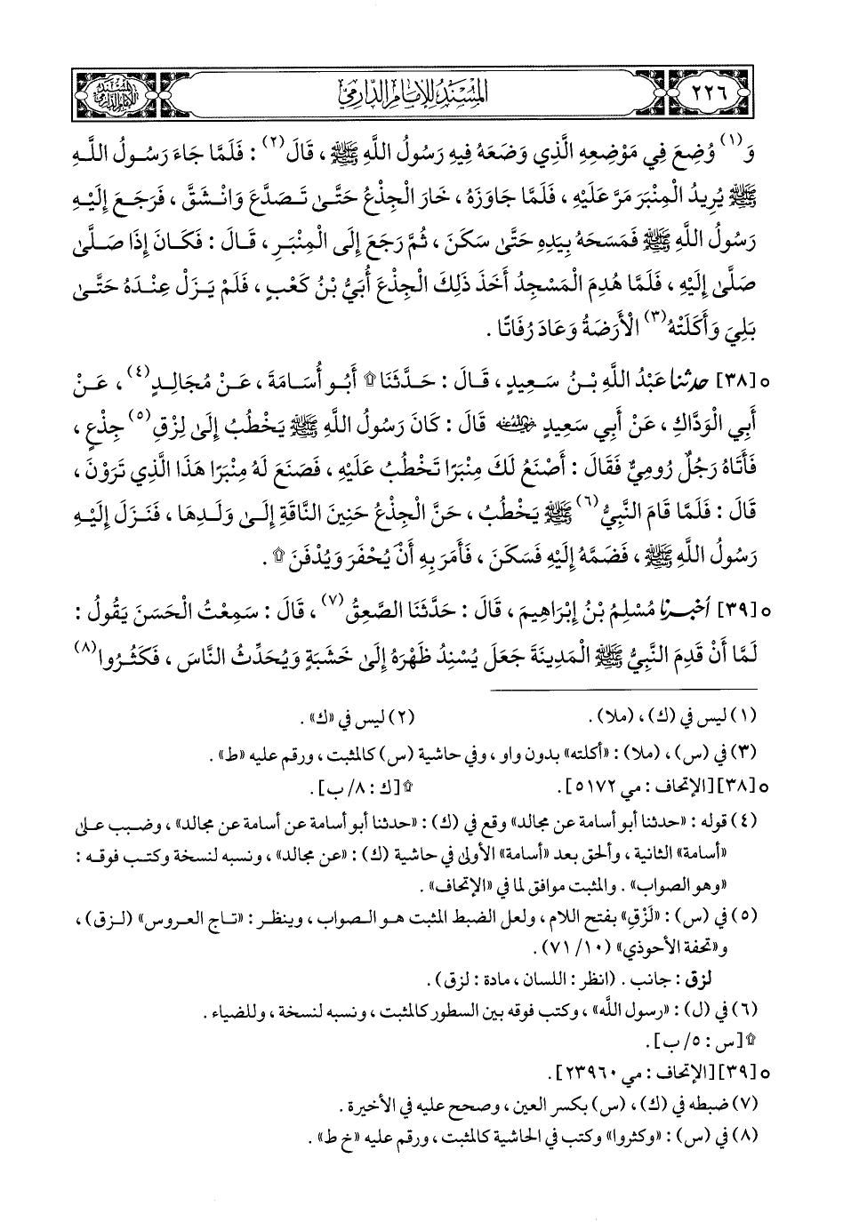 38- حَدَّثَنَا عَبْدُ اللهِ بْنُ سَعِيدٍ (1), قَالَ: حَدَّثَنَا أَبُو أُسَامَةَ, عَنْ مُجَالِدٍ, عَنْ أَبِي الْوَدَّاكِ, عَنْ أَبِي سَعِيدٍ رَضِيَ اللهُ عَنْهُ, قَالَ: كَانَ رَسُولُ اللهِ صَلى الله عَليهِ وسَلم يَخْطُبُ إِلَى لِزْقِ جِذْعٍ, فَأَتَاهُ رَجُلٌ رُومِيٌّ, فَقَالَ: أَصْنَعُ لَكَ مِنْبَرًا تَخْطُبُ عَلَيْهِ, فَصَنَعَ لَهُ مِنْبَرًا, هَذَا الَّذِي تَرَوْنَ, قَالَ: فَلَمَّا قَامَ النَّبِيُّ صَلى الله عَليهِ وسَلم يَخْطُبُ, حَنَّ الْجِذْعُ حَنِينَ النَّاقَةِ إِلَى وَلَدِهَا, فَنَزَلَ إِلَيْهِ رَسُولُ اللهِ صَلى الله عَليهِ وسَلم, فَضَمَّهُ إِلَيْهِ فَسَكَنَ, فَأَمَرَ بِهِ أَنْ يُحْفَرَ وَيُدْفَنَ.