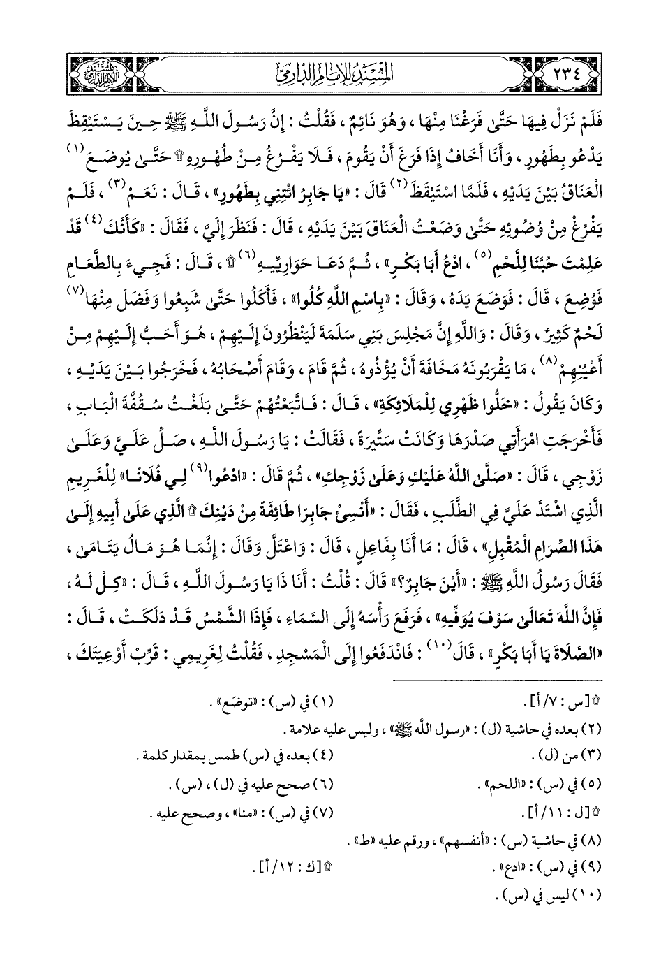 قَالَ: فَنَظَرَ إِلَيَّ, فَقَالَ: كَأَنَّكَ قَدْ عَلِمْتَ حُبَّنَا للَّحْمِ, ادْعُ أَبَا بَكْرٍ, ثُمَّ دَعَا حَوَارِيِّيهِ, قَالَ: فَجِيءَ بِالطَّعَامِ فَوُضِعَ, قَالَ: فَوَضَعَ يَدَهُ وَقَالَ: بِسْمِ اللهِ كُلُوا, فَأَكَلُوا حَتَّى شَبِعُوا وَفَضَلَ مِنْهَا لَحْمٌ كَثِيرٌ وَقَالَ: وَاللهِ إِنَّ مَجْلِسَ بَنِي سَلَمَةَ لَيَنْظُرُونَ إِلَيْهِمْ هُوَ أَحَبُّ إِلَيْهِمْ مِنْ أَعْيُنِهِمْ مَا يَقْرَبُونَهُ مَخَافَةَ أَنْ يُؤْذُوهُ, ثُمَّ قَامَ وَقَامَ أَصْحَابُهُ, فَخَرَجُوا بَيْنَ يَدَيْهِ, وَكَانَ يَقُولُ: خَلُّوا ظَهْرِي لِلْمَلاَئِكَةِ, قَالَ: فَاتَّبَعْتُهُمْ, حَتَّى بَلَغْتُ سُقُفَّةَ الْبَابِ, فَأَخْرَجَتِ امْرَأَتِي صَدْرَهَا, وَكَانَتْ سَتِّيرَةً, فَقَالَتْ: يَا رَسُولَ اللهِ, صَلِّ عَلَيَّ وَعَلَى زَوْجِي, قَالَ: صَلَّى اللهُ عَلَيْكِ وَعَلَى زَوْجِكِ, ثُمَّ قَالَ: ادْعُوا لِي فُلاَنًا, لِلْغَرِيمِ الَّذِي اشْتَدَّ عَلَيَّ فِي الطَّلَبِ, فَقَالَ: أَنْسِئْ (1) جَابِرًا طَائِفَةً مِنْ دَيْنِكَ الَّذِي عَلَى أَبِيهِ إِلَى هَذَا الصِّرَامِ الْمُقْبِلِ, قَالَ: مَا أَنَا بِفَاعِلٍ, قَالَ: وَاعْتَلَّ, وَقَالَ: إِنَّمَا هُوَ مَالُ يَتَامَى, فَقَالَ رَسُولُ اللهِ صَلى الله عَليهِ وسَلم: أَيْنَ جَابِرٌ؟ قَالَ: قُلْتُ: أَنَا ذَا يَا رَسُولَ اللهِ, قَالَ: كِلْ لَهُ, فَإِنَّ اللهَ تَعَالَى سَوْفَ يُوَفِّيهِ, فَرَفَعَ رَأْسَهُ إِلَى السَّمَاءِ, فَإِذَا الشَّمْسُ قَدْ دَلَكَتْ, قَالَ: الصَّلاَةَ يَا أَبَا بَكْرٍ, قَالَ: فَانْدَفَعُوا إِلَى الْمَسْجِدِ, فَقُلْتُ لِغَرِيمِي: قَرِّبْ أَوْعِيَتَكَ, فَكِلْتُ لَهُ مِنَ الْعَجْوَةِ, فَوَفَّاهُ اللهُ, وَفَضَلَ لَنَا مِنَ التَّمْرِ كَذَا وَكَذَا, وَكِلْتُ لَهُ مِنْ أَصْنَافِ التَّمْرِ, فَوَفَّاهُ اللهُ, وَفَضَلَ لَنَا مِنَ التَّمْرِ كَذَا وَكَذَا, قَالَ: فَجِئْتُ أَسْعَى إِلَى رَسُولِ اللهِ صَلى الله عَليهِ وسَلم فِي مَسْجِدِهِ, كَأَنِّي شَرَارَةٌ, فَوَجَدْتُ رَسُولَ اللهِ صَلى الله عَليهِ وسَلم قَدْ صَلَّى, فَقُلْتُ: يَا رَسُولَ اللهِ, إِنِّي قَدْ كِلْتُ لِغَرِيمِي تَمْرَهُ, فَوَفَّاهُ اللهُ, وَفَضَلَ لَنَا مِنَ التَّمْرِ كَذَا وَكَذَا, فَقَالَ رَسُولُ اللهِ صَلى الله عَليهِ وسَلم: أَيْنَ عُمَرُ بْنُ الْخَطَّابِ؟ قَالَ: فَجَاءَ يُهَرْوِلُ, قَالَ: سَلْ جَابِرَ بْنَ عَبْدِ اللهِ عَنْ غَرِيمِهِ وَتَمْرِهِ, قَالَ: مَا أَنَا بِسَائِلِهِ, قَدْ عَلِمْتُ أَنَّ اللهَ تَعَالَى سَوْفَ يُوَفِّيهِ إِذْ أَخْبَرْتَ أَنَّ اللهَ سَوْفَ يُوَفِّيهِ, فَرَدَّدَ عَلَيْهِ, وَرَدَّدَ عَلَيْهِ هَذِهِ الْكَلِمَةَ ثَلاَثَ مَرَّاتٍ, كُلُّ ذَلِكَ يَقُولُ: مَا أَنَا بِسَائِلِهِ, وَكَانَ لاَ يُرَاجَعُ بَعْدَ الْمَرَّةِ الثَّالِثَةِ, فَقَالَ: مَا فَعَلَ غَرِيمُكَ وَتَمْرُكَ؟ قَالَ: قُلْتُ: وَفَّاهُ اللهُ, وَفَضَلَ لَنَا مِنَ التَّمْرِ كَذَا وَكَذَا.