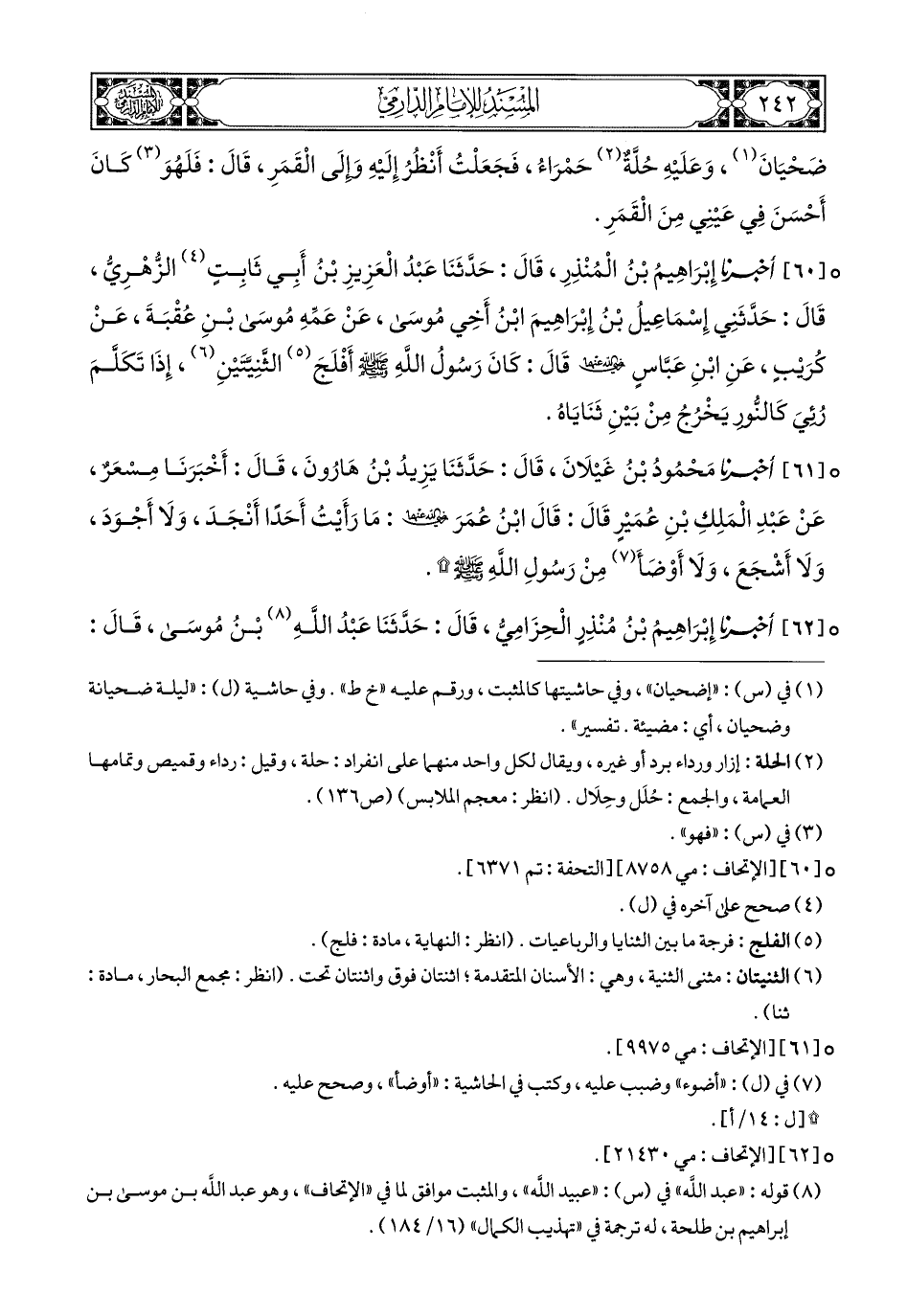 60- أَخبَرَنا إِبْرَاهِيمُ بْنُ الْمُنْذِرِ, قَالَ: حَدَّثَنَا عَبْدُ الْعَزِيزِ بْنُ أَبِي ثَابِتٍ الزُّهْرِيُّ, قَالَ: حَدَّثَنِي إِسْمَاعِيلُ بْنُ إِبْرَاهِيمَ, ابْنُ أَخِي مُوسَى, عَنْ عَمِّهِ مُوسَى بْنِ عُقْبَةَ, عَنْ كُرَيْبٍ, عَنِ ابْنِ عَبَّاسٍ رَضِيَ اللهُ عَنْهُمَا, قَالَ: كَانَ رَسُولُ اللهِ صَلى الله عَليهِ وسَلم أَفْلَجَ الثَّنِيَّتَيْنِ, إِذَا تَكَلَّمَ رُئِيَ كَالنُّورِ يَخْرُجُ مِنْ بَيْنِ ثَنَايَاهُ.
