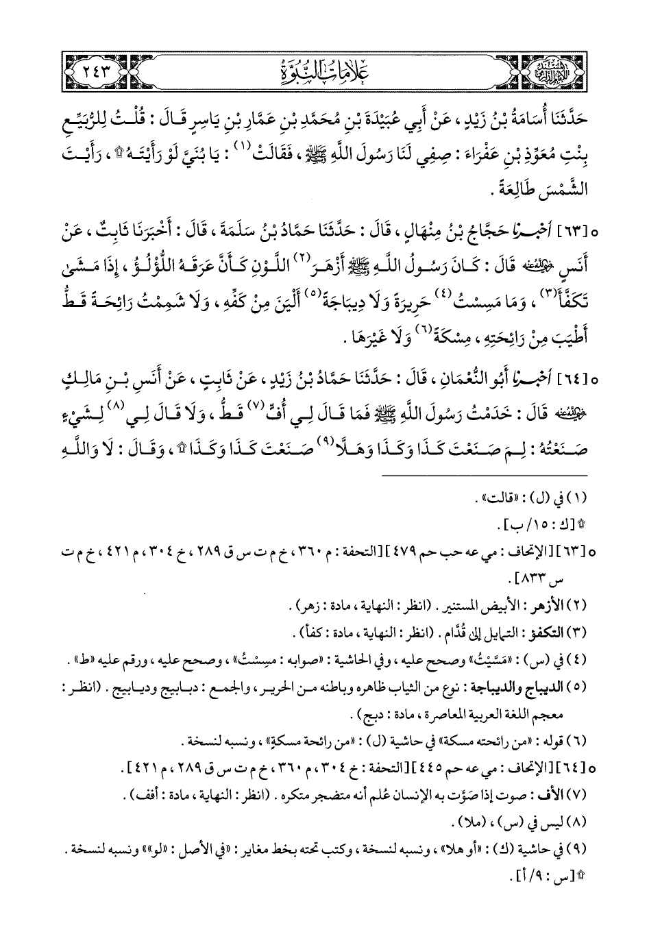63- أَخبَرَنا حَجَّاجُ بْنُ مِنْهَالٍ, قَالَ: حَدَّثَنَا حَمَّادُ بْنُ سَلَمَةَ, قَالَ: أَخبَرَنا ثَابِتٌ, عَنْ أَنَسٍ رَضِيَ اللهُ عَنْهُمَا, قَالَ: كَانَ رَسُولُ اللهِ صَلى الله عَليهِ وسَلم أَزْهَرَ اللَّوْنِ, كَأَنَّ عَرَقَهُ اللُّؤْلُؤُ, إِذَا مَشَى تَكَفَّأَ, وَمَا مَسِسْتُ حَرِيرَةً, وَلاَ دِيبَاجَةً أَلْيَنَ مِنْ كَفِّهِ, وَلاَ شَمِمْتُ رَائِحَةً قَطُّ أَطْيَبَ مِنْ رَائِحَتِهِ مِسْكَةً, وَلاَ غَيْرَهَا.