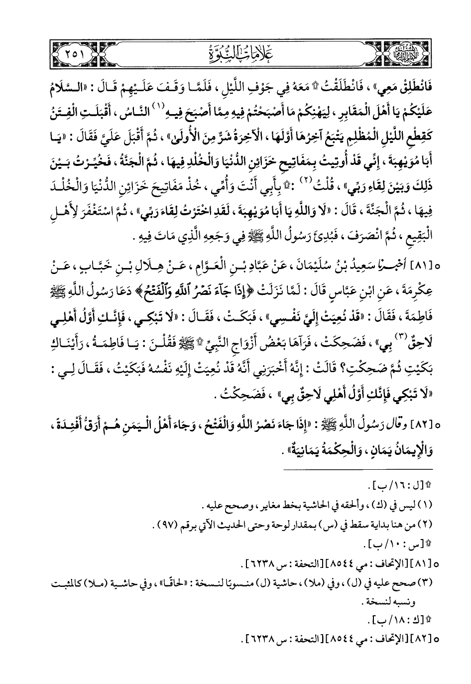 81- أَخبَرَنا سَعِيدُ بْنُ سُلَيْمَانَ, عَنْ (1) عَبَّادِ بْنِ الْعَوَّامِ, عَنْ (1) هِلاَلِ بْنِ خَبَّابٍ, عَنْ عِكْرِمَةَ, عَنِ ابْنِ عَبَّاسٍ, قَالَ: لَمَّا نَزَلَتْ: {إِذَا جَاءَ نَصْرُ اللهِ وَالْفَتْحُ} (2), دَعَا رَسُولُ اللهِ صَلى الله عَليهِ وسَلم فَاطِمَةَ, فَقَالَ: قَدْ نُعِيَتْ إِلَيَّ نَفْسِي, فَبَكَتْ, فَقَالَ: لاَ تَبْكِي, فَإِنَّكِ أَوَّلُ أَهْلِي لاَحِقٌ بِي, فَضَحِكَتْ, فَرَآهَا بَعْ