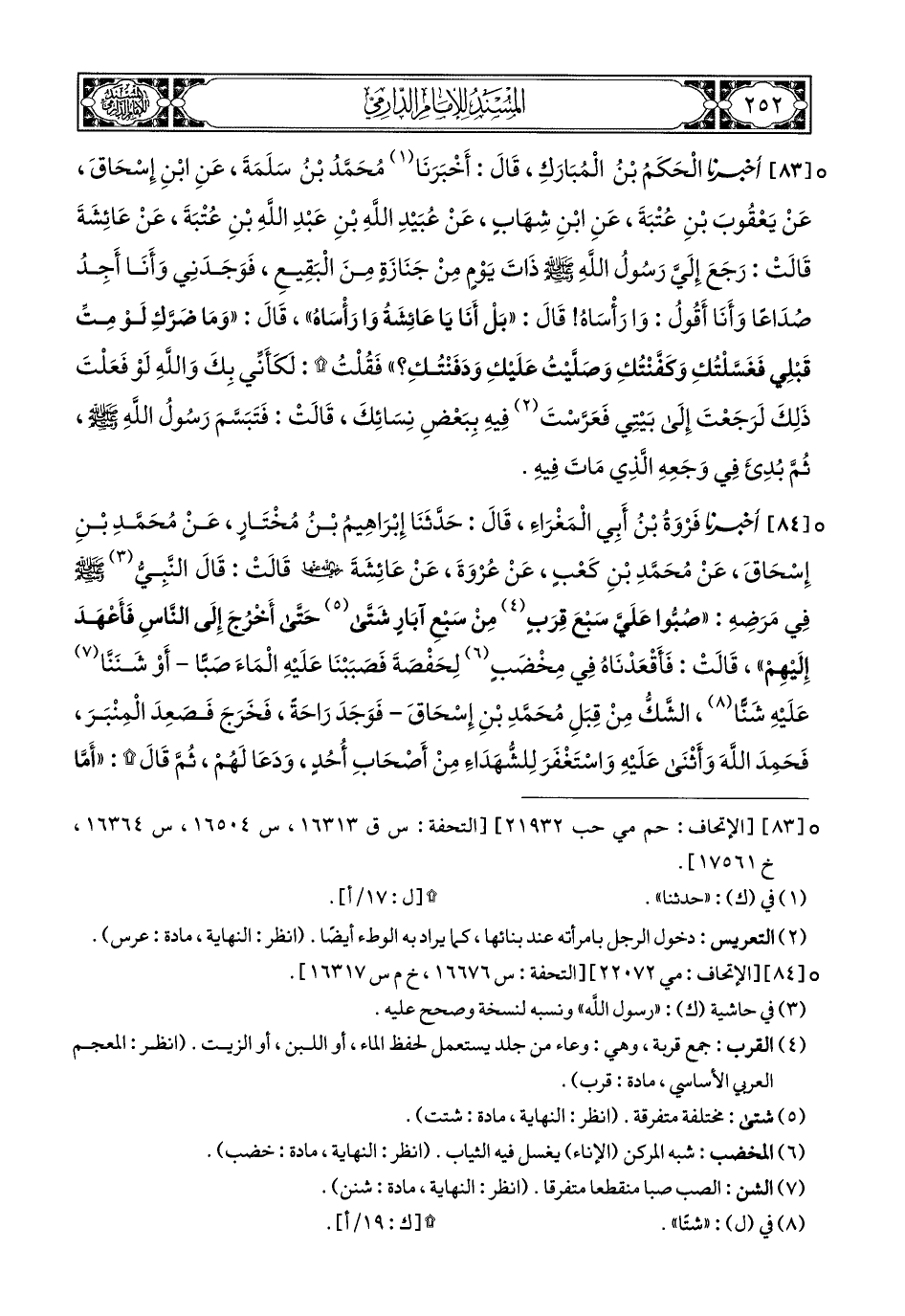83- أَخبَرَنا الْحَكَمُ بْنُ الْمُبَارَكِ, قَالَ: أَخبَرَنا مُحَمَّدُ بْنُ سَلَمَةَ, عَنِ ابْنِ إِسْحَاقَ, عَنْ يَعْقُوبَ بْنِ عُتْبَةَ, عَنِ ابْنِ شِهَابٍ, عَنْ عُبَيْدِ اللهِ بْنِ عَبْدِ اللهِ بْنِ عُتْبَةَ, عَنْ عَائِشَةَ, قَالَتْ: رَجَعَ إِلَيَّ رَسُولُ اللهِ صَلى الله عَليهِ وسَلم ذَاتَ يَوْمٍ مِنْ جَنَازَةٍ مِنَ الْبَقِيعِ, فَوَجَدَنِي وَأَنَا أَجِدُ صُدَاعًا, وَأَنَا أَقُولُ: وَارَأْسَاهُ, قَالَ: بَلْ أَنَا يَا عَائِشَةُ وَارَأْسَاهُ, قَالَ: وَمَا ضَرَّكِ لَوْ مِتِّ قَبْلِي, فَغَسَّلْتُكِ وَكَفَّنْتُكِ, وَصَلَّيْتُ عَلَيْكِ وَدَفَنْتُكِ, فَقُلْتُ: لَكَأَنِّي بِكَ وَاللهِ لَوْ فَعَلْتَ ذَلِكَ لَرَجَعْتَ إِلَى بَيْتِي, فَعَرَّسْتَ فِيهِ بِبَعْضِ نِسَائِكَ, قَالَتْ: فَتَبَسَّمَ رَسُولُ اللهِ صَلى الله عَليهِ وسَلم, ثُمَّ بُدِئَ فِي وَجَعِهِ الَّذِي مَاتَ فِيهِ.
