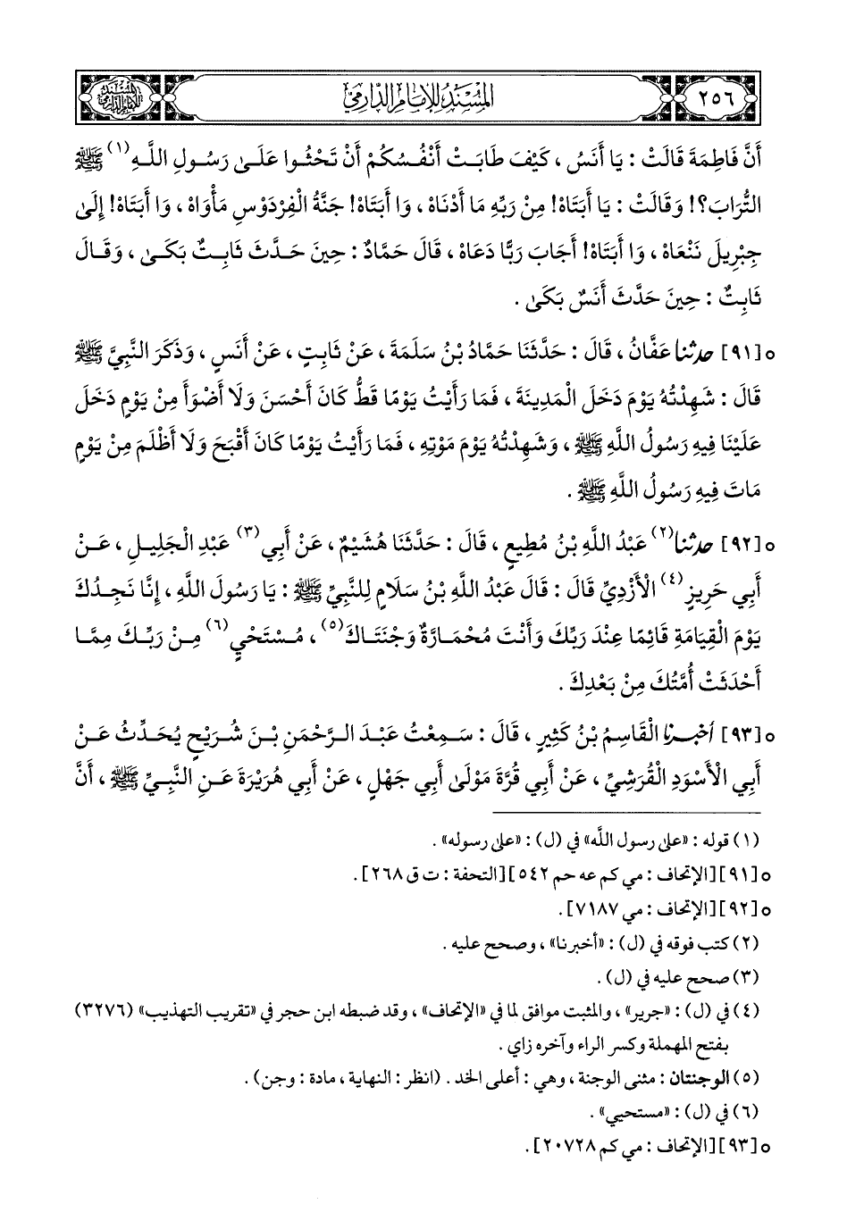 91- حَدَّثَنَا عَفَّانُ, قَالَ: حَدَّثَنَا حَمَّادُ بْنُ سَلَمَةَ, عَنْ ثَابِتٍ, عَنْ أَنَسٍ, وَذَكَرَ النَّبِيَّ صَلى الله عَليهِ وسَلم, قَالَ: شَهِدْتُهُ يَوْمَ دَخَلَ الْمَدِينَةَ, فَمَا رَأَيْتُ يَوْمًا قَطُّ كَانَ أَحْسَنَ, وَلاَ أَضْوَأَ مِنْ يَوْمٍ دَخَلَ عَلَيْنَا فِيهِ رَسُولُ اللهِ صَلى الله عَليهِ وسَلم, وَشَهِدْتُهُ يَوْمَ مَوْتِهِ, فَمَا رَأَيْتُ يَوْمًا كَانَ أَقْبَحَ, وَلاَ أَظْلَمَ مِنْ يَوْمٍ مَاتَ فِيهِ رَسُولُ اللهِ صَلى الله عَليهِ وسَلم.