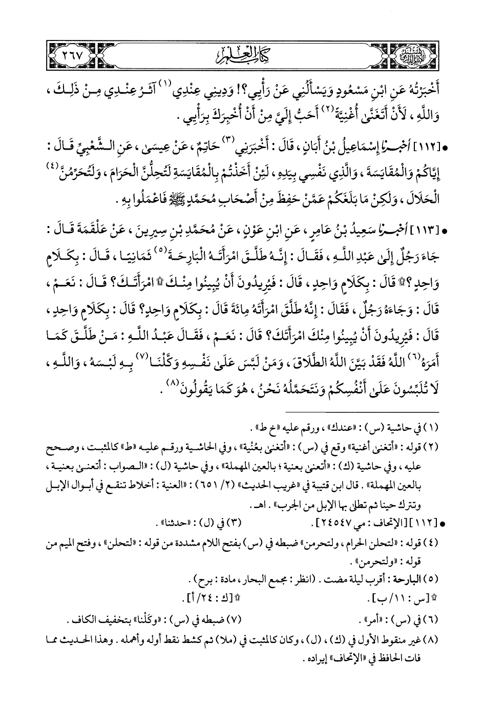 113- أَخبَرَنا سَعِيدُ بْنُ عَامِرٍ, عَنِ ابْنِ عَوْنٍ, عَنْ مُحَمَّدِ بْنِ سِيرِينَ, عَنْ عَلْقَمَةَ, قَالَ: جَاءَ رَجُلٌ إِلَى عَبْدِ اللهِ, فَقَالَ: إِنَّهُ طَلَّقَ امْرَأَتَهُ الْبَارِحَةَ ثَمَانِيًا, قَالَ: بِكَلاَمٍ وَاحِدٍ؟ قَالَ: بِكَلاَمٍ وَاحِدٍ, قَالَ: فَيُرِيدُونَ أَنْ يُبِينُوا مِنْكَ امْرَأَتَكَ؟ قَالَ: نَعَمْ, قَالَ: وَجَاءَهُ رَجُلٌ, فَقَالَ: إِنَّهُ طَلَّقَ امْرَأَتَهُ مِئَةً (1), قَالَ: بِكَلاَمٍ وَاحِدٍ؟ قَالَ: بِكَلاَمٍ وَاحِدٍ, قَالَ: فَيُرِيدُونَ أَنْ يُبِينُوا مِنْكَ امْرَأَتَكَ؟ قَالَ: نَعَمْ, فَقَالَ عَبْدُ اللهِ: مَنْ طَلَّقَ كَمَا أَمَرَهُ اللهُ, فَقَدْ بَيَّنَ اللهُ الطَّلاَقَ, وَمَنْ لَبَّسَ عَلَى نَفْسِهِ, وَكَّلْنَا بِهِ لَبْسَهُ, وَاللهِ لاَ تُلَبِّسُونَ عَلَى أَنْفُسِكُمْ وَنَتَحَمَّلُهُ نَحْنُ هُوَ كَمَا يَقُولُونَ (2).