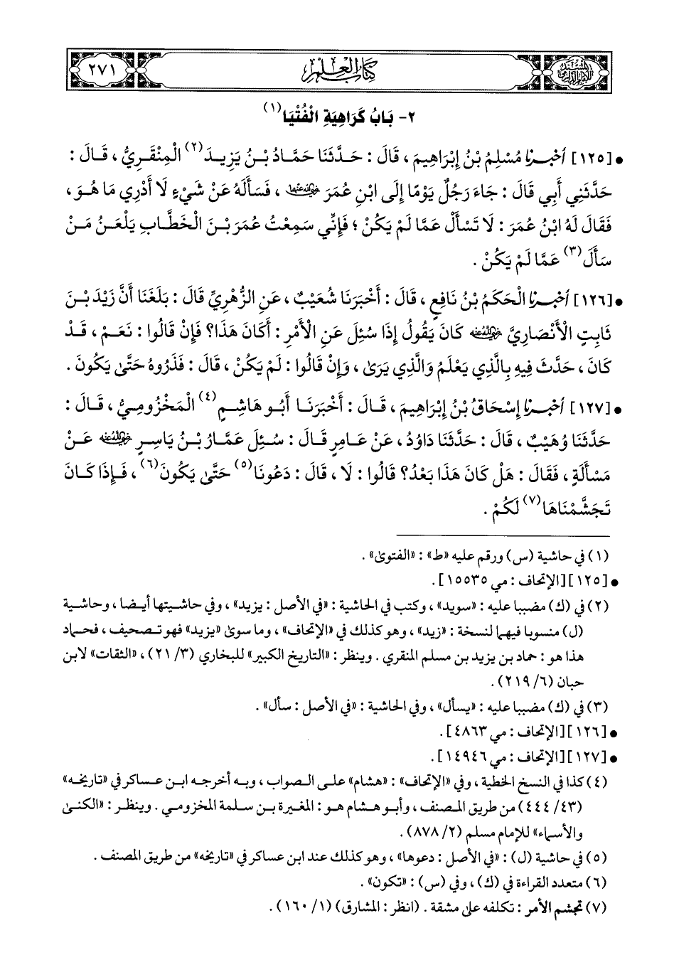 125- أَخبَرَنا مُسْلِمُ بْنُ إِبْرَاهِيمَ, قَالَ: حَدَّثَنَا حَمَّادُ بْنُ يزِيدَ (1) الْمِنْقَرِيِّ, قَالَ: حَدَّثَنِي أَبِي, قَالَ: جَاءَ رَجُلٌ يَوْمًا إِلَى ابْنِ عُمَرَ رَضِيَ اللهُ عَنْهُمَا, فَسَأَلَهُ عَنْ شَيْءٍ لاَ أَدْرِي مَا هُوَ, فَقَالَ لَهُ ابْنُ عُمَرَ: لاَ تَسْأَلْ عَمَّا لَمْ يَكُنْ, فَإِنِّي سَمِعْتُ عُمَرَ بْنَ الْخَطَّابِ يَلْعَنُ مَنْ سَأَلَ (2) عَمَّا لَمْ يَكُنْ.