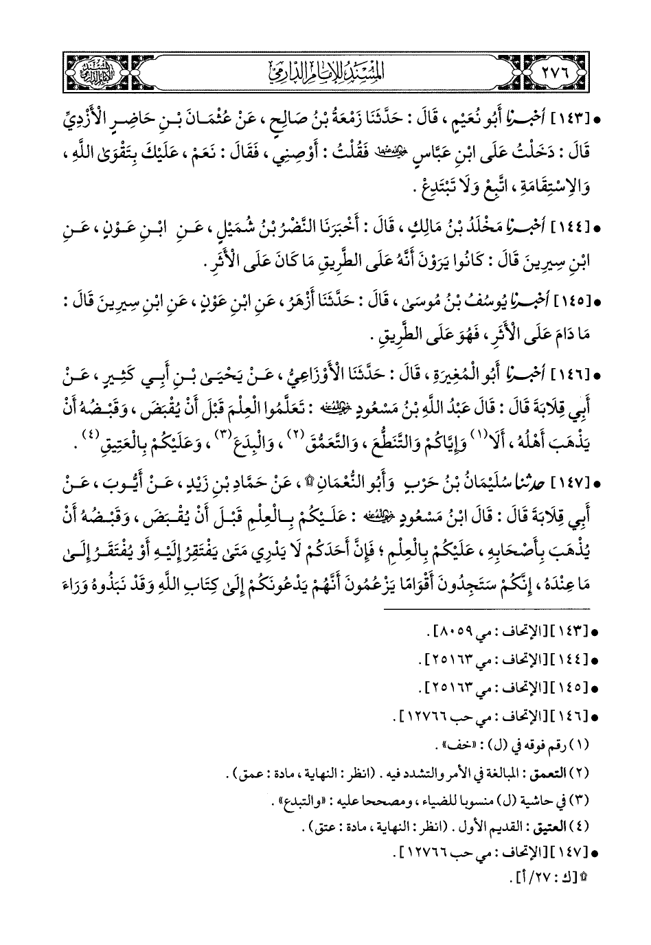 147- حَدَّثَنَا سُلَيْمَانُ بْنُ حَرْبٍ, وَأَبُو النُّعْمَانِ, عَنْ حَمَّادِ بْنِ زَيْدٍ, عَنْ أَيُّوبَ, عَنْ أَبِي قِلاَبَةَ, قَالَ: قَالَ ابْنُ مَسْعُودٍ رَضِيَ اللهُ عَنْهُ: عَلَيْكُمْ بِالْعِلْمِ قَبْلَ أَنْ يُقْبَضَ, وَقَبْضُهُ أَنْ يُذْهَبَ بِأَصْحَابِهِ (1), عَلَيْكُمْ (2) بِالْعِلْمِ, فَإِنَّ أَحَدَكُمْ لاَ يَدْرِي مَتَى يَفْتَقِرُ إِلَيْهِ, أَوْ يُفْتَقَرُ إِلَى مَا عِنْدَهُ, إِنَّكُمْ سَتَجِدُونَ أَقْوَامًا يَزْعُمُونَ أَنَّهُمْ يَدْعُونَكُمْ إِلَى كِتَابِ اللهِ, وَقَدْ نَبَذُوهُ وَرَاءَ ظُهُورِهِمْ, فَعَلَيْكُمْ بِالْعِلْمِ, وَإِيَّاكُمْ وَالتَّبَدُّعَ, وَإِيَّاكُمْ وَالتَّنَطُّعَ, وَإِيَّاكُمْ وَالتَّعَمُّقَ, وَعَلَيْكُمْ بِالْعَتِيقِ.