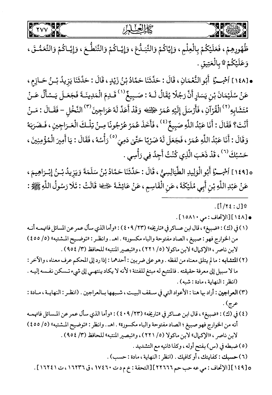 148- أَخبَرَنا أَبُو النُّعْمَانِ, قَالَ: حَدَّثَنَا حَمَّادُ بْنُ زَيْدٍ, قَالَ: حَدَّثَنَا يَزِيدُ بْنُ حَازِمٍ, عَنْ سُلَيْمَانَ بْنِ يَسَارٍ, أَنَّ رَجُلاً يُقَالُ لَهُ: صَبِيغٌ, قَدِمَ الْمَدِينَةَ, فَجَعَلَ يَسْأَلُ عَنْ مُتَشَابِهِ الْقُرْآنِ, فَأَرْسَلَ إِلَيْهِ عُمَرُ رَضِيَ اللهُ عَنْهُ, وَقَدْ أَعَدَّ لَهُ عَرَاجِينَ النَّخْلِ, فَقَالَ: مَنْ أَنْتَ؟ فَقَالَ: أَنَا عَبْدُ اللهِ صَبِيغٌ, فَأَخَذَ عُمَرُ عُرْجُونًا مِنْ تِلْكَ الْعَرَاجِينِ فَضَرَبَهُ, وَقَالَ: أَنَا عَبْدُ اللهِ عُمَرُ, فَجَعَلَ لَهُ ضَرَبًا, حَتَّى دَمِيَ رَأْسُهُ, فَقَالَ: يَا أَمِيرَ الْمُؤْمِنِينَ, حَسْبُكَ, قَدْ ذَهَبَ الَّذِي كُنْتُ أَجِدُ فِي رَأْسِي.