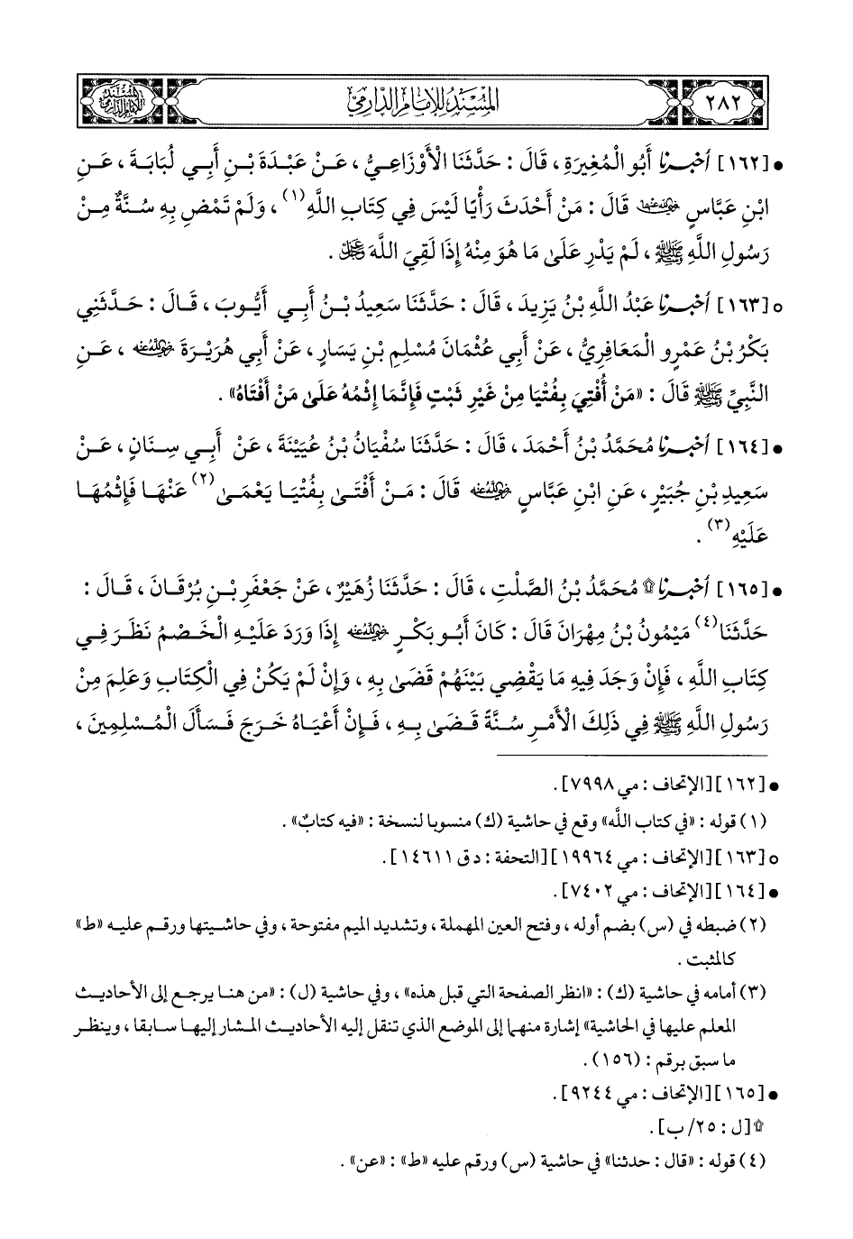 163- أَخبَرَنا عَبْدُ اللهِ بْنُ يَزِيدَ (1), قَالَ: حَدَّثَنَا سَعِيدُ بْنُ أَبِي أَيُّوبَ, قَالَ: حَدَّثَنِي بَكْرُ بْنُ عَمْرٍو الْمُعَافِرِيُّ, عَنْ أَبِي عُثْمَانَ مُسْلِمِ بْنِ يَسَارٍ, عَنْ أَبِي هُرَيْرَةَ رَضِيَ اللهُ عَنْهُ, عَنِ النَّبِيِّ صَلى الله عَليهِ وسَلم, قَالَ: مَنْ أُفْتِيَ بِفُتْيَا مِنْ غَيْرِ ثَبْتٍ (2), فَإِنَّمَا إِثْمُهُ عَلَى مَنْ أَفْتَاهُ.
