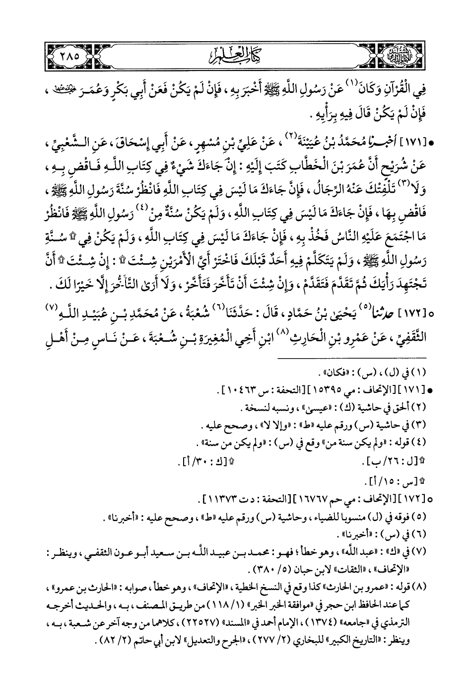 171- أَخبَرَنا مُحَمَّدُ بْنُ عُيَيْنَةَ, عَنْ عَلِيِّ بْنِ مُسْهِرٍ, عَنْ أَبِي إِسْحَاقَ, عَنِ الشَّعْبِيِّ, عَنْ شُرَيْحٍ؛ أَنَّ عُمَرَ بْنَ الْخَطَّابِ كَتَبَ إِلَيْهِ: إِنْ جَاءَكَ شَيْءٌ فِي كِتَابِ اللهِ, فَاقْضِ بِهِ, وَلاَ تَلْفِتْكَ (1) عَنْهُ الرِّجَالُ, فَإِنْ جَاءَكَ مَا لَيْسَ فِي كِتَابِ اللهِ, فَانْظُرْ سُنَّةَ رَسُولِ اللهِ صَلى الله عَليهِ وسَلم, فَاقْضِ بِهَا, فَإِنْ جَاءَكَ مَا لَيْسَ فِي كِتَابِ اللهِ, وَلَمْ يَكُنْ سُنَّةٌ مِنْ (2) رَسُولِ اللهِ صَلى الله عَليهِ وسَلم, فَانْظُرْ مَا اجْتَمَعَ عَلَيْهِ النَّاسُ, فَخُذْ بِهِ, فَإِنْ جَاءَكَ مَا لَيْسَ فِي كِتَابِ اللهِ, وَلَمْ يَكُنْ فِي سُنَّةِ رَسُولِ اللهِ صَلى الله عَليهِ وسَلم, وَلَمْ يَتَكَلَّمْ فِيهِ أَحَدٌ قَبْلَكَ, فَاخْتَرْ أَيَّ الأَمْرَيْنِ شِئْتَ, إِنْ شِئْتَ أَنْ تَجْتَهِدَ رَأْيَكَ, ثُمَّ تَقَدَّمَ فَتَقَدَّمْ, وَإِنْ شِئْتَ أَنْ تَأَخَّرَ (3) فَتَأَخَّرْ, وَلاَ أَرَى التَّأَخُّرَ إِلاَّ خَيْرًا لَكَ.